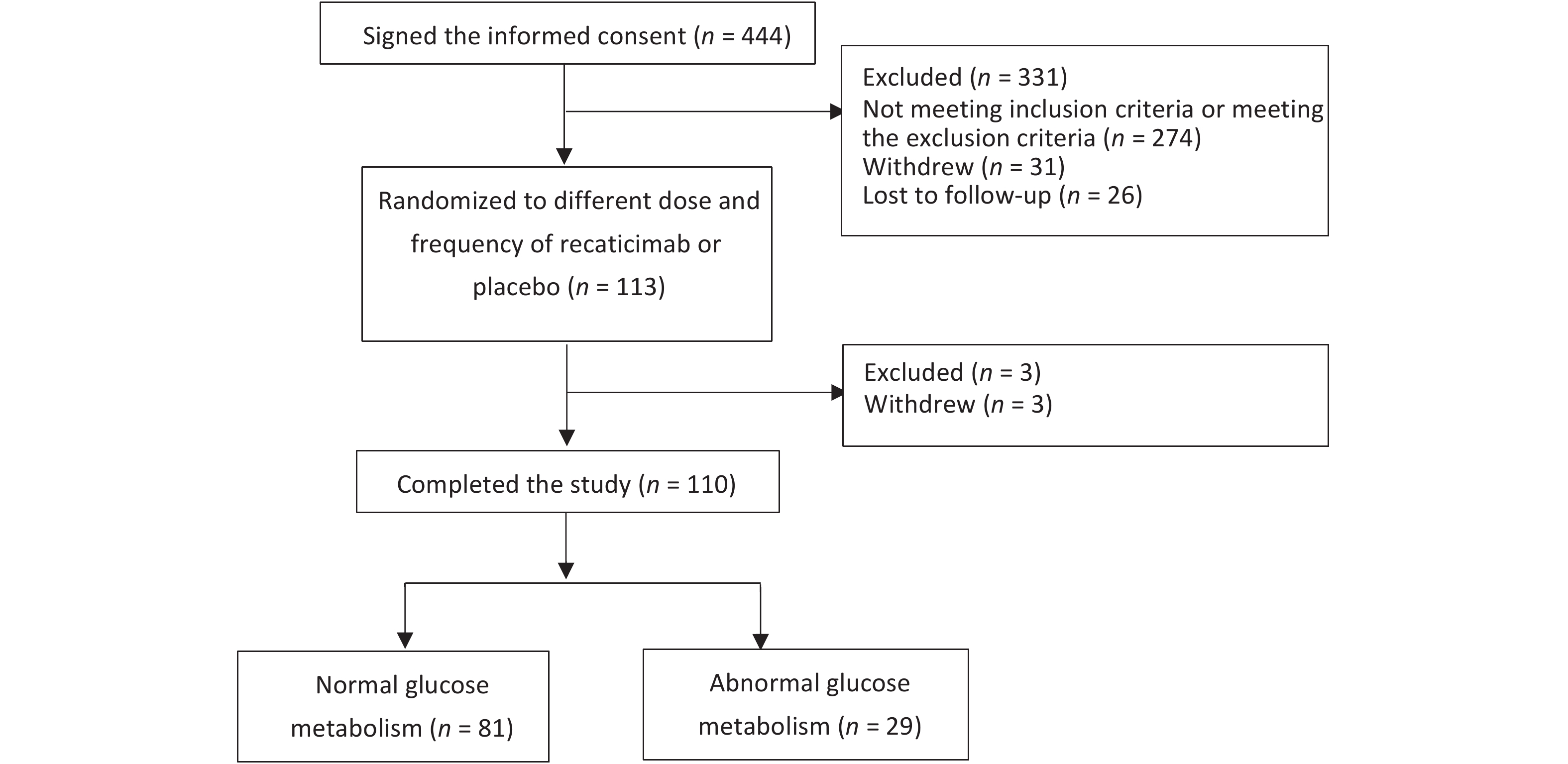 Objective Recaticimab (SHR-1209) significantly reduces low-density lipoprotein cholesterol levels. However, its effect on glucose metabolism remains unclear. This study aimed to evaluate its effect on glycemic parameters in a Chinese population. Methods Recaticimab versus placebo was administered in a 5:1 ratio to 110 hyperlipidemia patients who were followed up for 24 weeks. Glycated hemoglobin (HbA1c) levels were measured at baseline every 12 weeks. Fasting plasma glucose (FPG) levels were measured at baseline at week 1, 3, 5, 8, 12, 16, 20, and 24. Repeated-measures mixed-effects models were used to determine the longitudinal association between reacticimab and FPG and HbA1c levels. Results Among the 81 participants with normal glucose metabolism, HbA1c levels significantly decreased (F = 4.568, P = 0.036). In the 29 participants with abnormal glucose metabolism, a significant time effect was observed for FPG levels (F = 2.492, P = 0.016). For participants with normal and abnormal glucose metabolism, no significant group × time interaction effects on FPG or HbA1c levels were identified. Conclusion Recaticimab showed no adverse glycemic effects in participants with normal or abnormal glucose metabolism, indicating its safety in patients with or without diabetes.