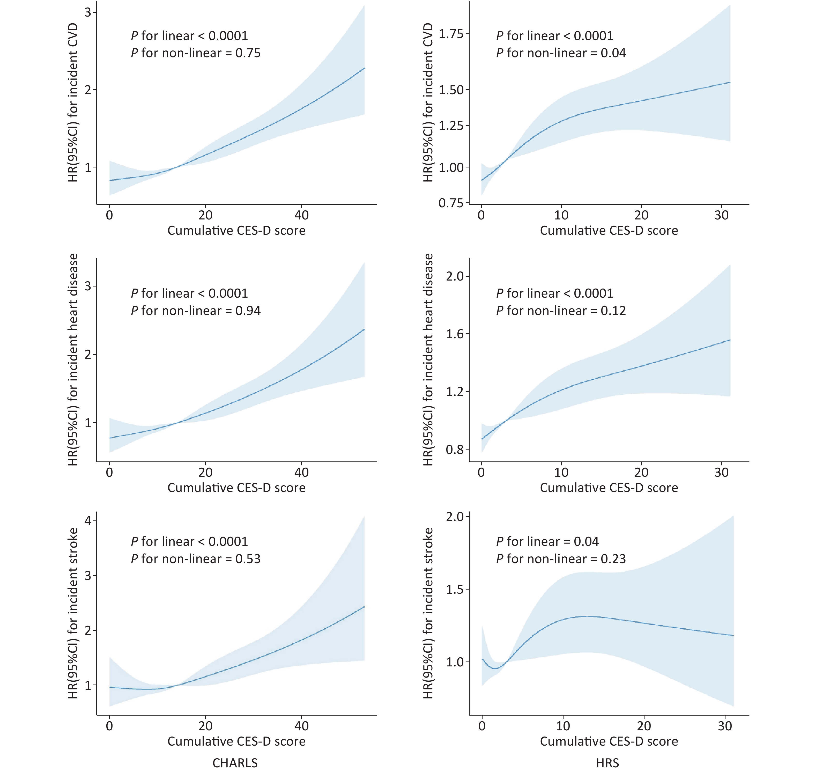 Objective Elevated depressive symptoms are well-documented among geriatric adults with cardiovascular disease (CVD); however, few studies have accounted for long-term cumulative depressive symptom exposure. This study determined the relationship between cumulative depressive symptoms and CVD.Methods Individual participant data were obtained from the China Health and Retirement Longitudinal Study (CHARLS) and Health and Retirement Study (HRS). Eligible participants had access to assessment information on depressive symptoms and had no history of CVD at baseline. Long-term cumulative depressive symptoms were estimated by calculating the area under the curve based on the Center for Epidemiological Studies Depression Scale.Results Herein, 8,861 participants from CHARLS (mean age: 58.58 years; male: 48.6%) and 7,284 from HRS (60.94 years; 35.0%) were enrolled. The median follow-up period was 5 years for the CHARLS and 10 years for the HRS. Compared with the first quartile of cumulative depressive symptoms, the HRs (95% CI) in the fourth quartile were 1.73 (1.48, 2.02) for predicting CVD (P < 0.001), 1.83 (1.52, 2.19) for heart disease (P < 0.001), 1.53 (1.17, 1.99) for stroke (P = 0.002) in CHARLS. For HRS, the HRs (95% CI) were 1.41 (1.27, 1.57; P < 0.001), 1.42 (1.26, 1.59; P < 0.001), and 1.30 (1.06, 1.58; P = 0.010) respectively. Strong dose-response relationships were observed, with similar results for the two cohorts.Conclusion Long-term cumulative depressive symptoms were significantly associated with incident CVD in middle-aged and older adults, providing insights into controlling long-term depressive symptoms to improve this cohort’s health.