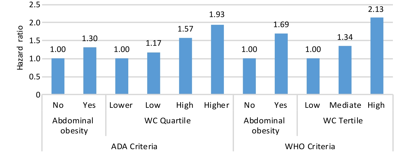Objective We examined the associations between obesity-related indices and the risk of diabetes progression from prediabetes in older adults, comparing the differences in using the American Diabetes Association (ADA) and World Health Organization (WHO) criteria. Methods Data were obtained from the Healthy Aging Evaluation Longitudinal Study conducted in China. At baseline, prediabetes (in participants without diabetes) was classified based on fasting plasma glucose (FPG) levels using both criteria. Body mass index (BMI) and waist circumference (WC) were categorized according to data distribution and diagnostic cut-off values, respectively. Cox proportional hazards regression models were used to estimate the adjusted hazard ratios (aHRs) with 95% confidence intervals (CIs) for obesity-related indices and diabetes progression from prediabetes. Results Among the 1,127 participants classified as prediabetic according to the ADA criteria, 474 met the WHO criteria. Under ADA-defined prediabetes, the highest WC quartile (≥ 93 cm) was significantly associated with an increased diabetes risk (aHR 1.93 [1.06, 3.53, P < 0.05]), whereas BMI-related and cut-off-based abdominal obesity demonstrated no significant associations (P > 0.05). Under WHO-defined prediabetes, both the high tertile of WC (≥ 90 cm) and general obesity (BMI ≥ 28.0 kg/m2) were significantly associated with progression to diabetes (P < 0.05), with aHR 2.13 (1.06, 4.27) and 2.44 (1.19, 5.01), respectively. However, cut-off-based abdominal obesity and the high BMI tertile (≥ 25.75 kg/m2) were not significantly associated with diabetes progression (P > 0.05). Conclusion Elevated WC, rather than BMI-based indices or cut-off-based abdominal obesity, was significantly associated with diabetes progression according to the ADA-defined prediabetes criteria. However, both the evaluated WC and general obesity predicted progression to diabetes according to the WHO criteria.