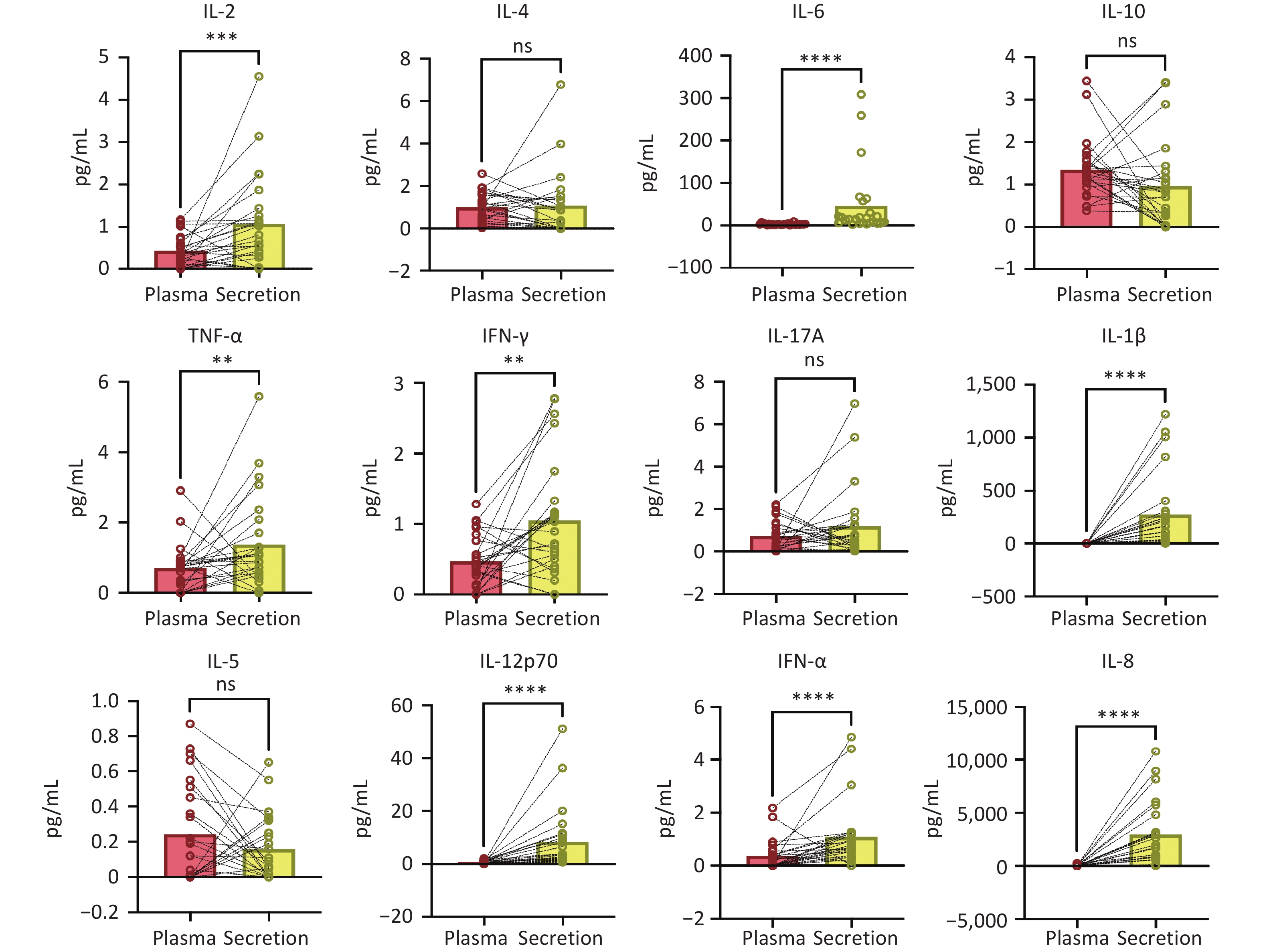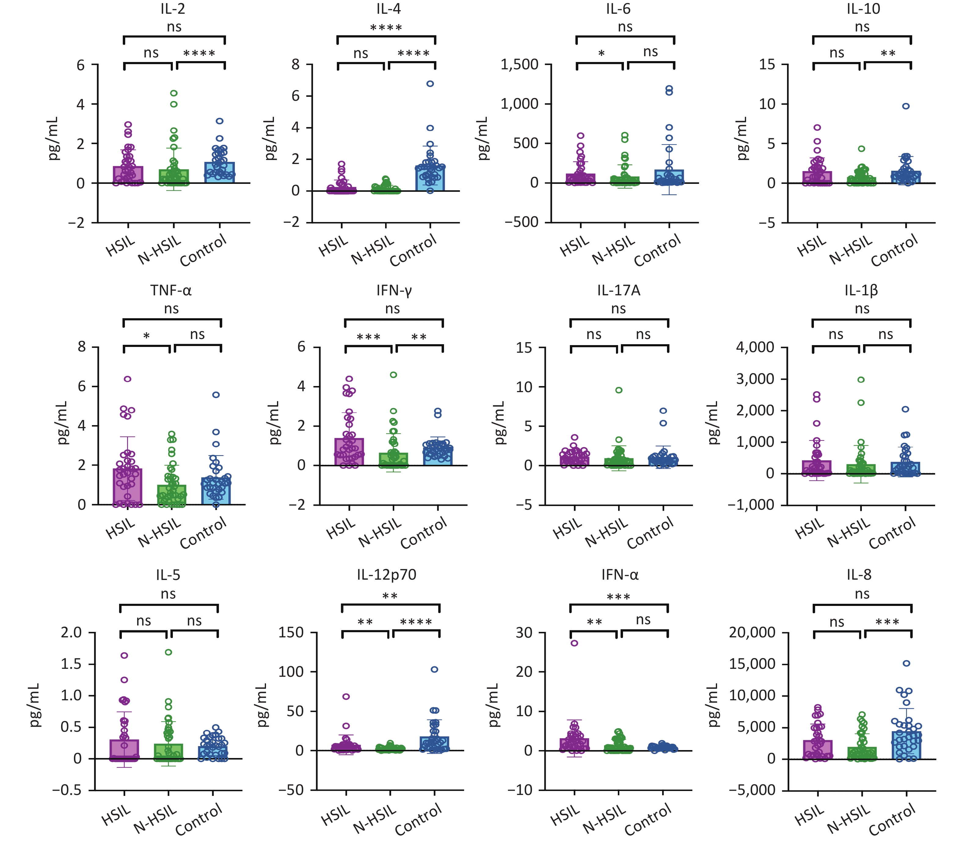 Objective The aim of this study was to analyze the correlation between the levels of 12 cytokines in the cervical microenvironment and cervical intraepithelial neoplasia in patients with high-risk human papillomavirus (HR-HPV) infection. Methods Female patients (n = 73) with HR-HPV infection were enrolled and divided into a high-grade squamous intraepithelial lesion (HSIL) group (n = 33) and a non-HSIL (N-HSIL) group (n = 40), which include low-grade squamous intraepithelial lesions and inflammation. Healthy screening subjects (n = 31) with negative HR-HPV results were enrolled as a control group. We examined contemporaneous plasma and secretory cytokines from 25 study subjects to investigate the difference between systemic cytokine profiles and the local microenvironment immunity using the Wilcoxon matched-pairs signed rank test. The 12 cytokines from cervical secretions were compared between the three groups using the Mann-Whitney test, and logistic regression was used to analyze HSIL and N-HSIL. Results There were statistical differences in eight cytokines (IL-2, IL-6, TNF-α, IFN-γ, IL-1β, IL-12p70, IFN-α, and IL-8) between cervical secretion and plasma of the same patient, and seven cytokines were statistically different between the control and other two groups. We selected four independent variables (TNF-α, IFN-γ, IL-12p70, and IFN-α) commonly identified by univariate regression analysis and non-parametric tests for multivariate logistic regression analysis. Based on this model, HSIL could be predicted in patients with HR-HPV infection, with the area under the curve being 0.76. Conclusion The systemic cytokine profile cannot reflect the local microenvironment immunity, and the occurrence of HSIL is related to the cytokine levels in the cervical microenvironment.