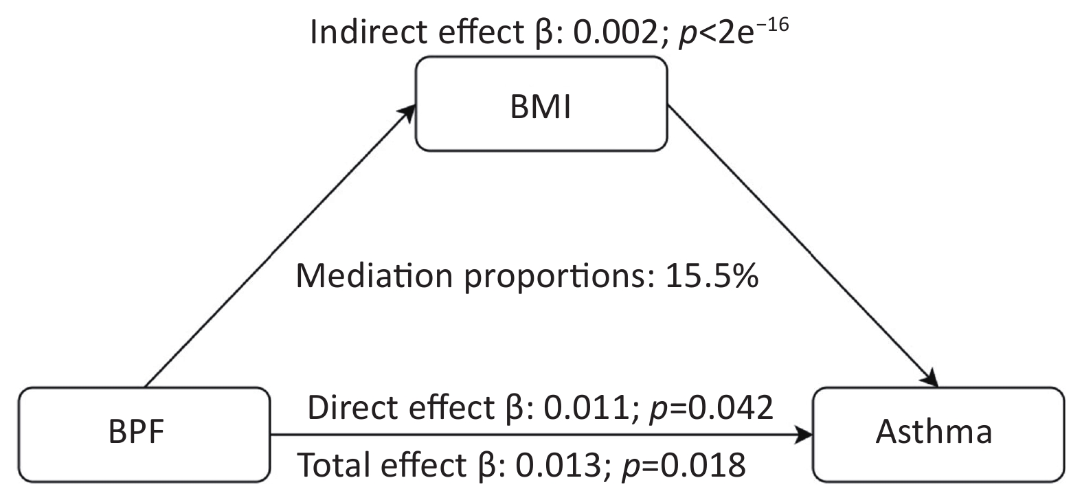 Objective Exposure to mixtures of environmental chemicals may influence asthma outcomes; however, the evidence remains equivocal. This study aimed to assess the association between mixed exposure to phenols and parabens and asthma outcomes in adults and to explore the mediating role of body mass index (BMI). Methods Based on data from the National Health and Nutrition Examination Survey (NHANES, 2013–2016), this study used multivariate generalized linear regression and weighted quantile sum (WQS) regression models to evaluate the associations between individual and joint exposure to phenols and parabens and asthma outcomes. These associations were further analyzed and stratified according to age and BMI. A mediation effect analysis was used to assess the role of BMI in this association. Results This study included 2,556 adults, of whom 400 (15.7%) were diagnosed with asthma. After adjusting for all covariates, a significant positive correlation was observed between the chemical mixture and asthma, with an odds ratio of 1.33 (95% confidence interval, 1.06–1.68). Among the eight phenols and parabens, bisphenol F (BPF), propylparaben (PrP), and bisphenol S (BPS) were the major contributors. Additionally, BMI mediated 15.5% of the association between BPF exposure and asthma. Conclusion In this cross-sectional study, mixed exposure to phenols and parabens was significantly associated with asthma outcomes, with BPF, PrP, and BPS identified as the primary contributing chemicals. This study provides valuable insights into the association between mixed chemical exposure and asthma as well as potential control pathways.