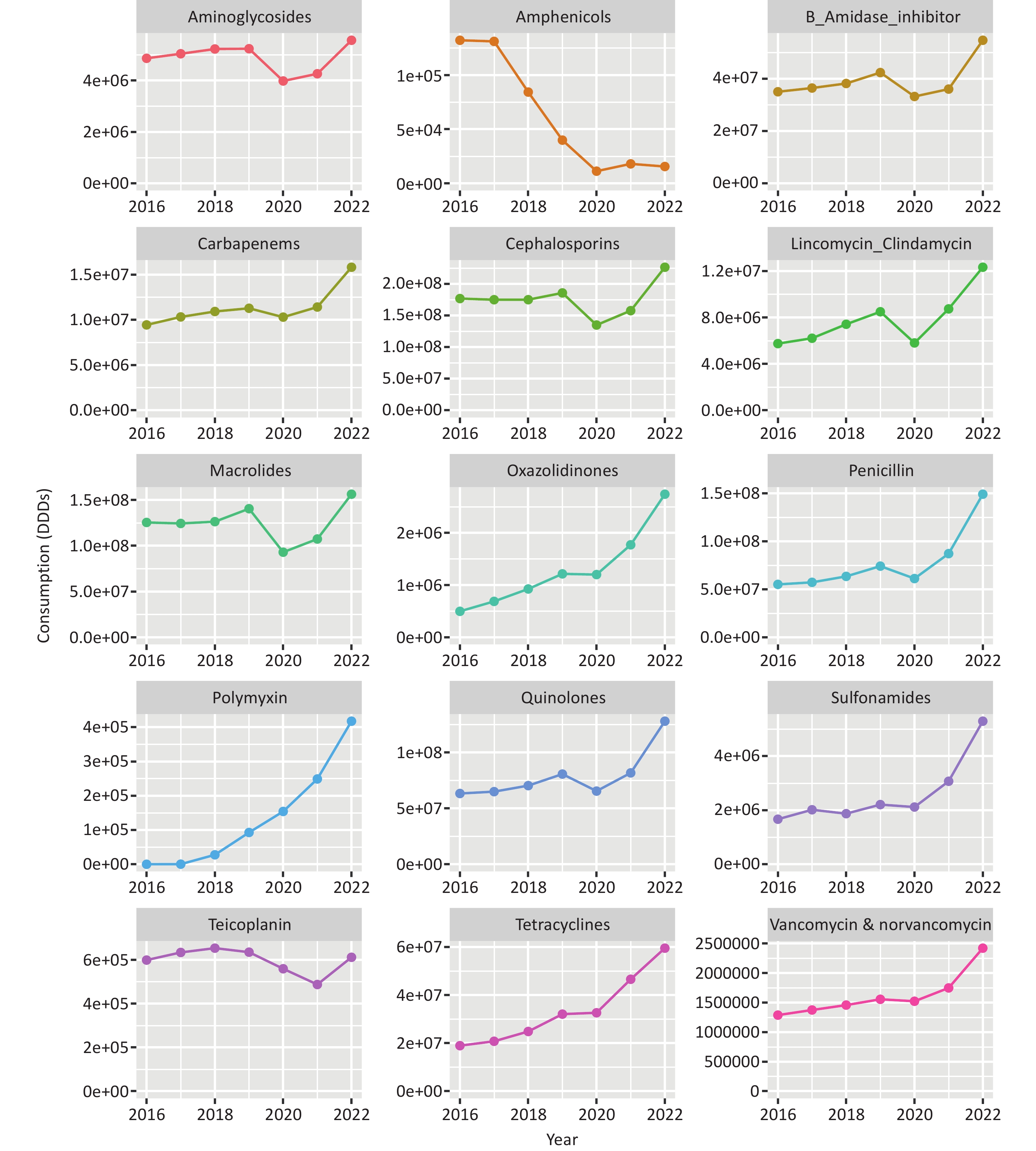 Objective To examine national trends in antibiotic consumption and antimicrobial resistance (AMR) among six WHO-priority bacterial pathogens in China from 2016 to 2022. Methods This ecological study analyzed national and provincial data from the China Antibacterial Resistance Surveillance System (CARSS) and the National Hospital Information Network. Beta regression models assessed temporal trends, and hierarchical models evaluated associations between antibiotic use and resistance. Results From 2016 to 2022, carbapenem resistance in Acinetobacter baumannii and Pseudomonas aeruginosa, and vancomycin resistance in Enterococcus faecium and E. faecalis significantly declined (β < 0, P < 0.010), while carbapenem-resistant Klebsiella pneumoniae increased (β = 0.081, P < 0.001). Nationwide antibiotic consumption rose across 10 major classes. Positive associations were found between carbapenem use and resistance in A. baumannii (z = 2.719, P = 0.007) and P. aeruginosa (z = 3.241, P = 0.001), and between vancomycin use and resistance in E. faecium (z = 4.510, P = 0.001) and E. faecalis (z = 3.210, P = 0.001). Conclusion Carbapenem-resistant K. pneumoniae increased significantly in China, while other resistant pathogens declined. Resistance patterns were linked to the use of multiple antibiotic classes, underscoring the need for strengthened antibiotic stewardship and surveillance.