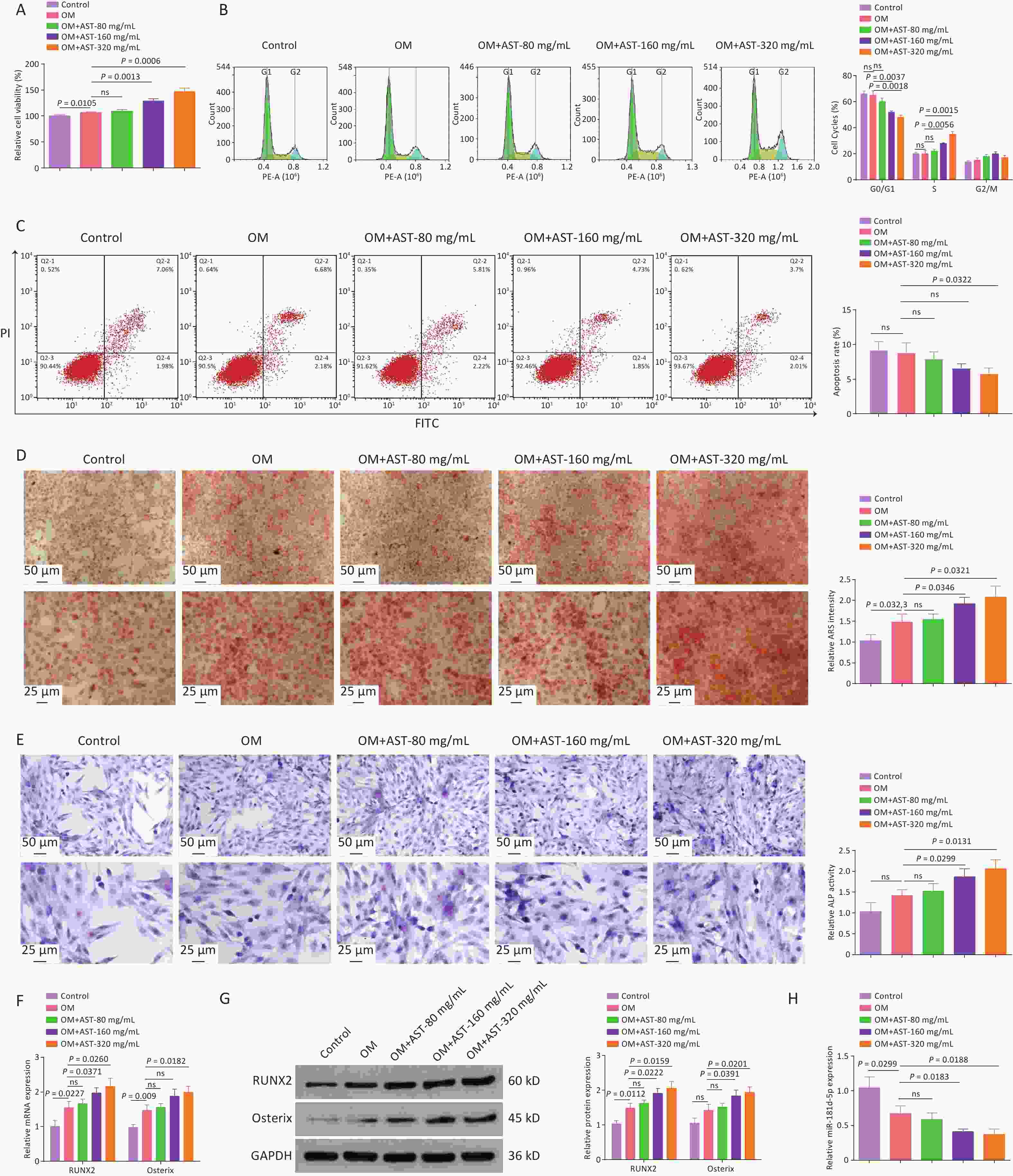 Objective This study aimed to investigate the effect of Astragalus (AST) on osteoporosis (OP) and the downstream mechanisms. Methods Human bone marrow-derived mesenchymal stem cells (hBMSCs) were induced to differentiate into osteogenic cells. After transfection with relevant plasmids, cell proliferation, cell cycle progression, and apoptosis were assessed. Alizarin red staining was used to detect calcium nodules in the cells, alkaline phosphatase (ALP) staining was used to detect ALP activity in the cells, and quantitative reverse transcription-polymerase chain reaction and western blotting were used to determine RUNX2 and Osterix expression levels. An OP rat model was established using ovariectomy and micro-computed tomography scanning. Hematoxylin and eosin staining and Masson’s trichrome staining were used to evaluate the pathological conditions of bone tissues, while immunohistochemistry was conducted to detect RUNX2 in bone tissues. Results AST promoted the osteogenic differentiation of BMSCs, reduced miR-181d-5p expression levels, and increased SOX11 expression levels. Restoring miR-181d-5p expression or reducing SOX11 expression levels reversed the effects of AST on the osteogenic differentiation of hBMSCs. miR-181d-5p was found to target SOX11 in hBMSCs. AST improved OP in rats, and miR-181d-5p overexpression or SOX11 inhibition reversed the therapeutic effects of AST on OP in rats. Conclusion AST promoted the osteogenic differentiation of hBMSCs and alleviated OP by targeting SOX11 via miR-181d-5p.