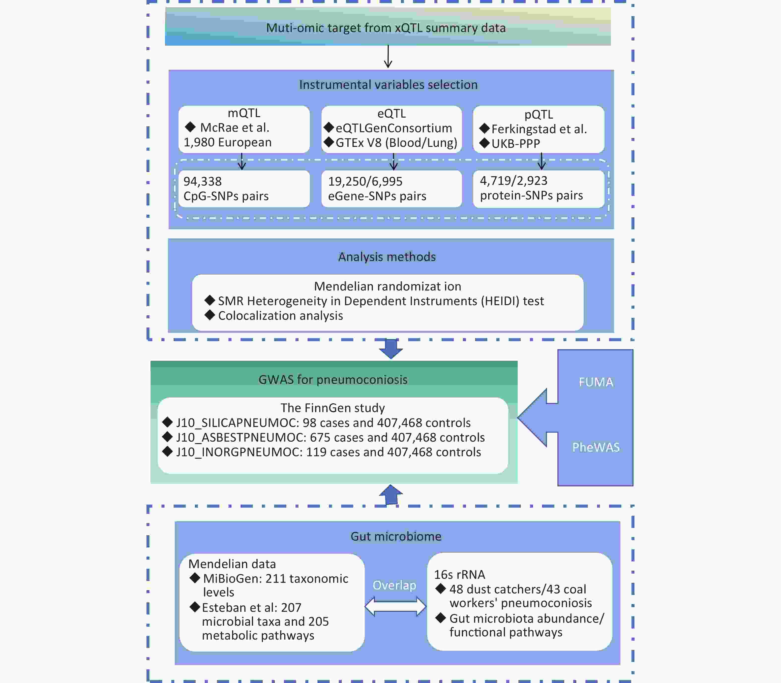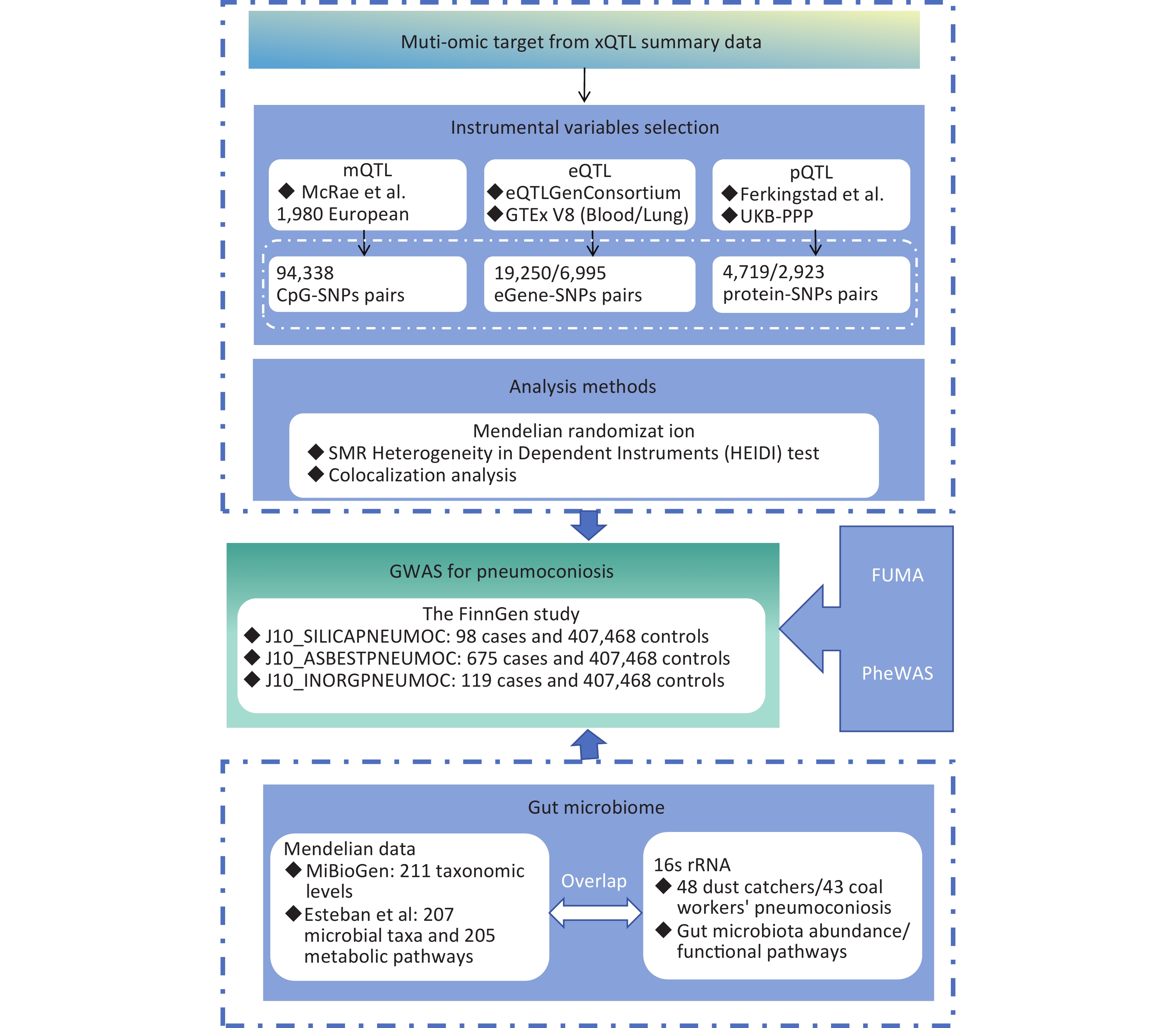 Objective Pneumoconiosis, a lung disease caused by irreversible fibrosis, represents a significant public health burden. This study investigates the causal relationships between gut microbiota, gene methylation, gene expression, protein levels, and pneumoconiosis using a multi-omics approach and Mendelian randomization (MR). Methods We analyzed gut microbiota data from MiBioGen and Esteban et al. to assess their potential causal effects on pneumoconiosis subtypes (asbestosis, silicosis, and inorganic pneumoconiosis) using conventional and summary-data-based MR (SMR). Gene methylation and expression data from Genotype-Tissue Expression and eQTLGen, along with protein level data from deCODE and UK Biobank Pharma Proteomics Project, were examined in relation to pneumoconiosis data from FinnGen. To validate our findings, we assessed self-measured gut flora from a pneumoconiosis cohort and performed fine mapping, drug prediction, molecular docking, and Phenome-Wide Association Studies to explore relevant phenotypes of key genes. Results Three core gut microorganisms were identified: Romboutsia (OR = 0.249) as a protective factor against silicosis, Pasteurellaceae (OR = 3.207) and Haemophilus parainfluenzae (OR = 2.343) as risk factors for inorganic pneumoconiosis. Additionally, mapping and quantitative trait loci analyses revealed that the genes VIM, STX8, and MIF were significantly associated with pneumoconiosis risk. Conclusions This multi-omics study highlights the associations between gut microbiota and key genes (VIM, STX8, MIF) with pneumoconiosis, offering insights into potential therapeutic targets and personalized treatment strategies.