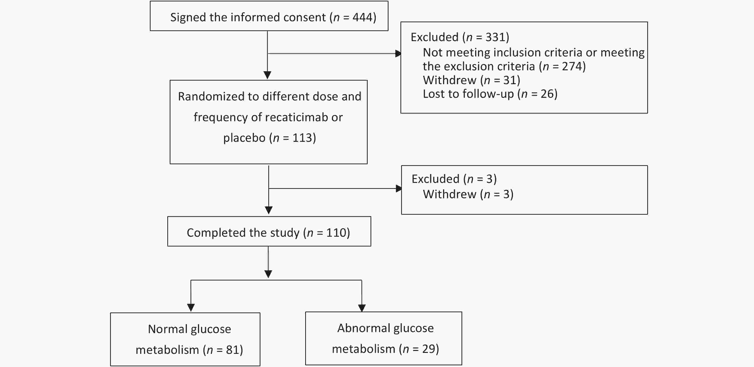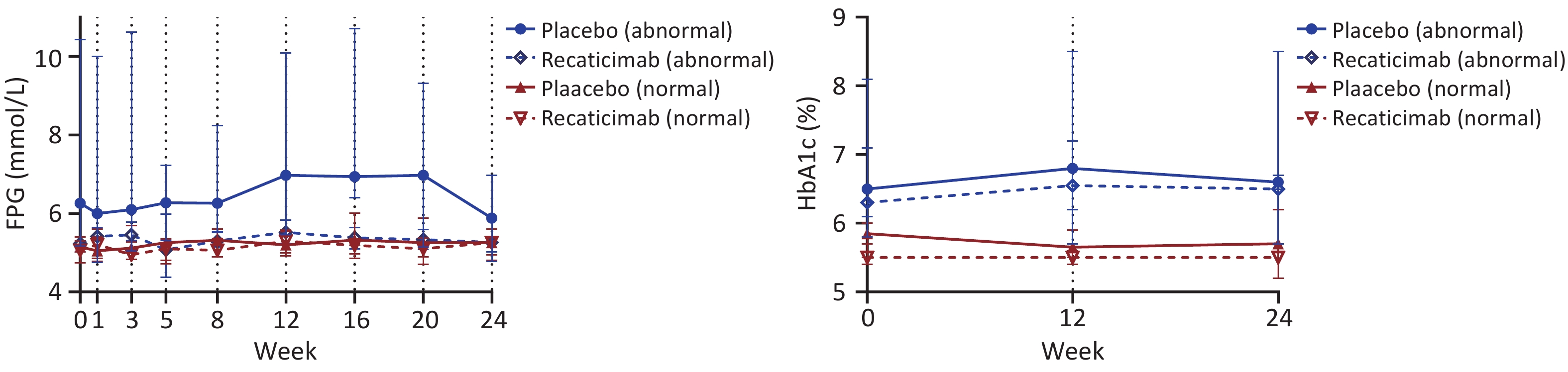Objective Recaticimab (SHR-1209) significantly reduces low-density lipoprotein cholesterol levels. However, its effect on glucose metabolism remains unclear. This study aimed to evaluate its effect on glycemic parameters in a Chinese population. Methods Recaticimab versus placebo was administered in a 5:1 ratio to 110 hyperlipidemia patients who were followed up for 24 weeks. Glycated hemoglobin (HbA1c) levels were measured at baseline every 12 weeks. Fasting plasma glucose (FPG) levels were measured at baseline at week 1, 3, 5, 8, 12, 16, 20, and 24. Repeated-measures mixed-effects models were used to determine the longitudinal association between reacticimab and FPG and HbA1c levels. Results Among the 81 participants with normal glucose metabolism, HbA1c levels significantly decreased (F = 4.568, P = 0.036). In the 29 participants with abnormal glucose metabolism, a significant time effect was observed for FPG levels (F = 2.492, P = 0.016). For participants with normal and abnormal glucose metabolism, no significant group × time interaction effects on FPG or HbA1c levels were identified. Conclusion Recaticimab showed no adverse glycemic effects in participants with normal or abnormal glucose metabolism, indicating its safety in patients with or without diabetes.