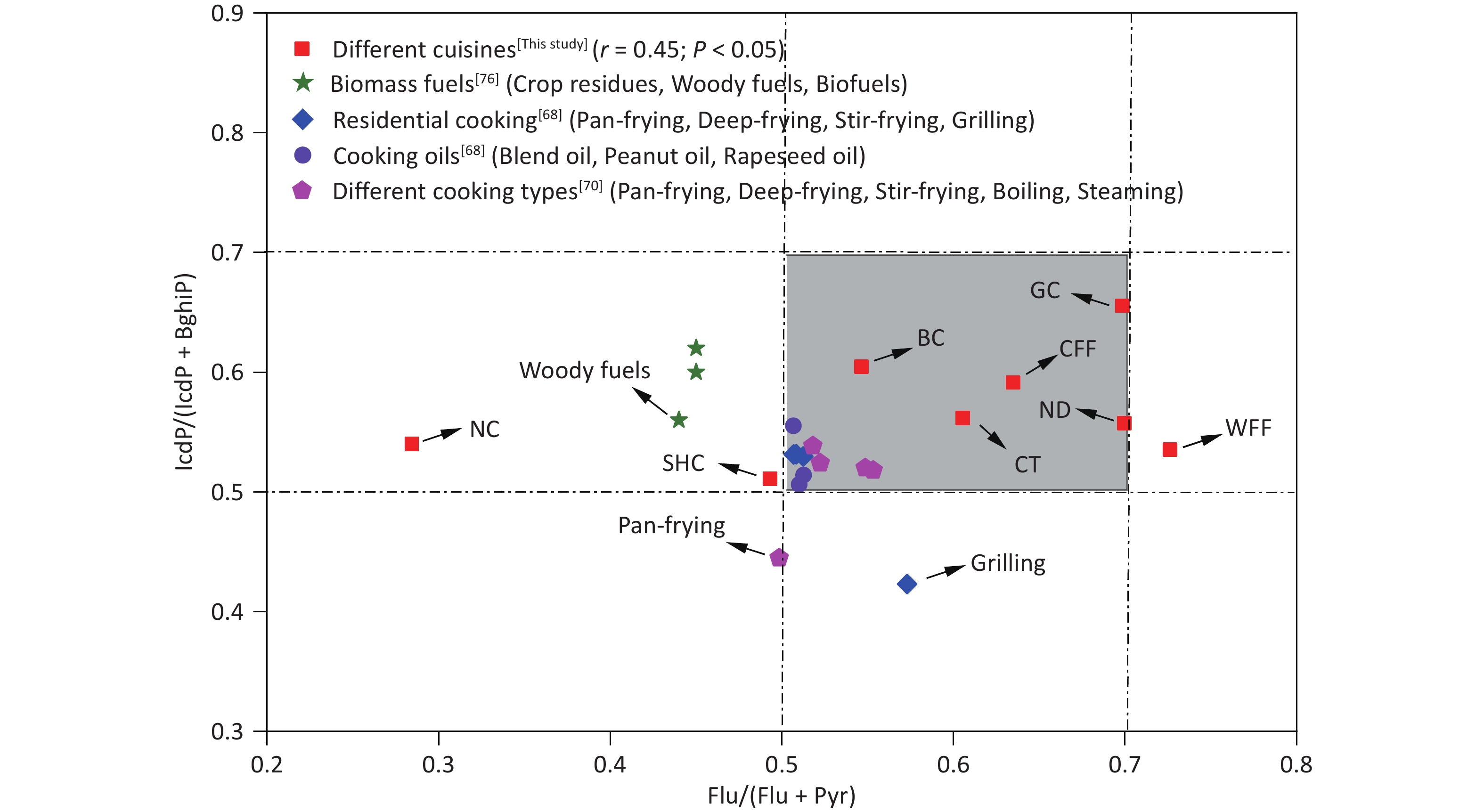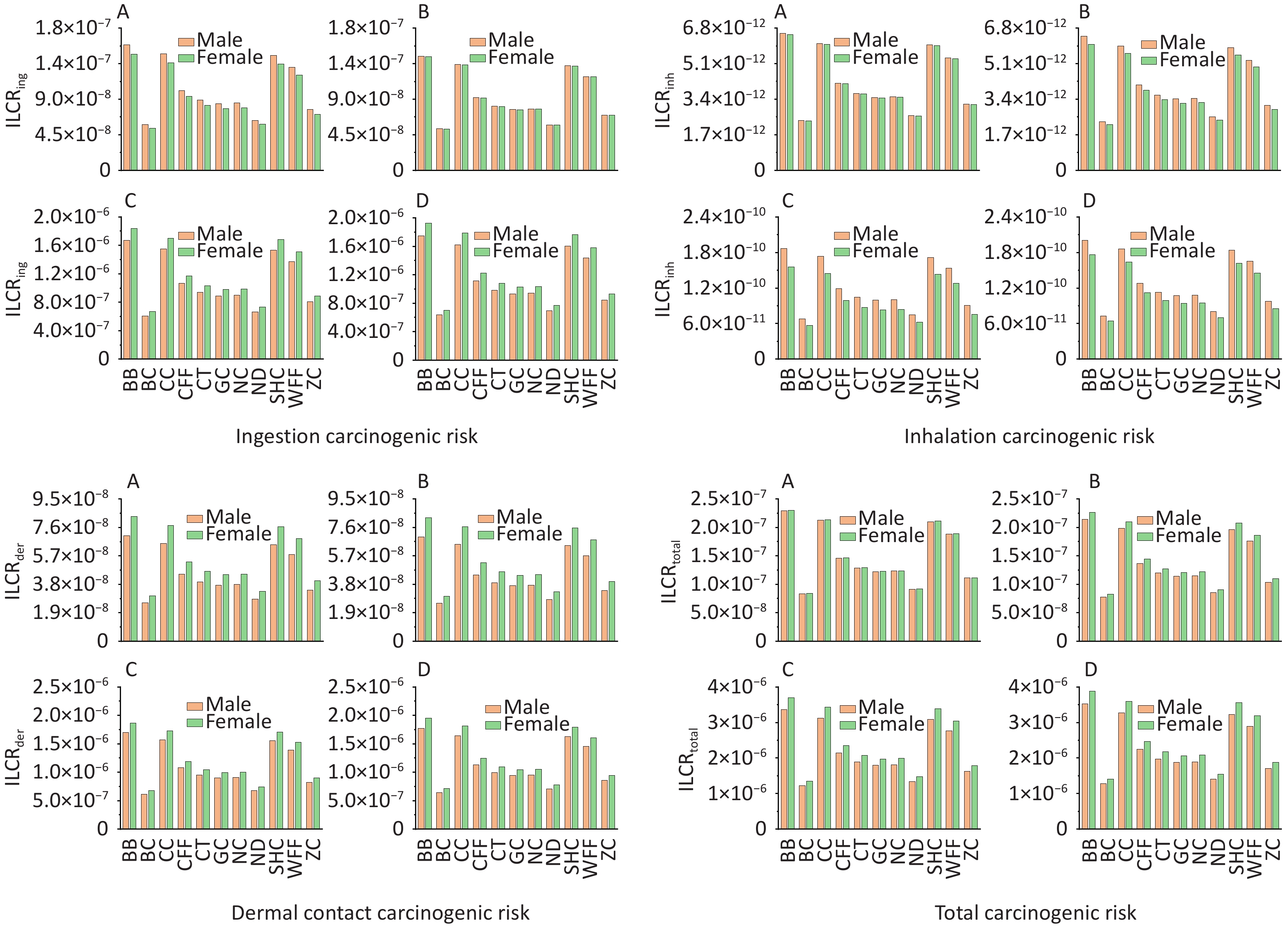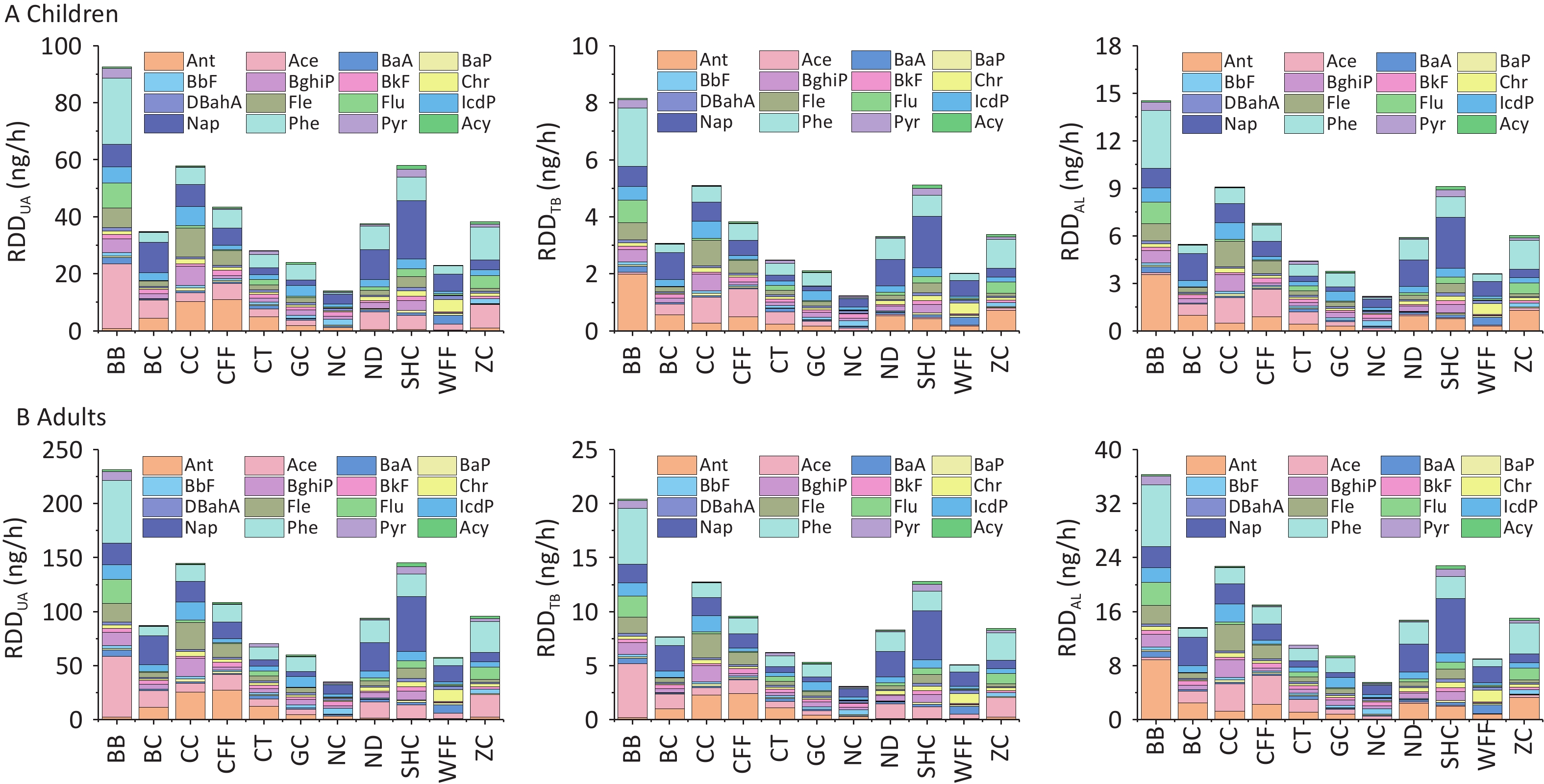 Objectives To characterize fine particulate matter (PM2.5)-bound polycyclic aromatic hydrocarbons (PAHs) emitted from different cooking fumes and their exposure routes and assess their health-associated impact to provide a reference for health risk prevention from PAH exposure across different age and sex groups. Methods Sixteen PM2.5-bound PAHs emitted from 11 cooking styles were analyzed using GC-MS/MS. The health hazards of these PAHs in the Handan City population (stratified by age and sex) were predicted using the incremental lifetime cancer risk (ILCR) model. The respiratory deposition doses (RDDs) of the PAHs in children and adults were calculated using the PM2.5 deposition rates in the upper airway, tracheobronchial, and alveolar regions. Results The total concentrations of PM2.5-bound PAHs ranged from 61.10 to 403.80 ng/m3. Regardless of cooking styles, the ILCRtotal values for adults (1.23 × 10−6 to 3.70 × 10−6) and older adults (1.28 × 10−6 to 3.88 × 10−6) exceeded the acceptable limit of 1.00 × 10–6. With increasing age, the ILCRtotal value first declined and then increased, varying substantially among the population groups. Cancer risk exhibited particularly high sensitivity to short exposure to barbecue-derived PAHs under equivalent body weights. Furthermore, barbecue, Sichuan and Hunan cuisine, Chinese cuisine, and Chinese fast food were associated with higher RDDs for both adults and children. Conclusion ILCRtotal values exceeded the acceptable limit for both females and males of adults, with all cooking styles showing a potentially high cancer risk. Our findings serve as an important reference for refining regulatory strategies related to catering emissions and mitigating health risks associated with cooking styles.