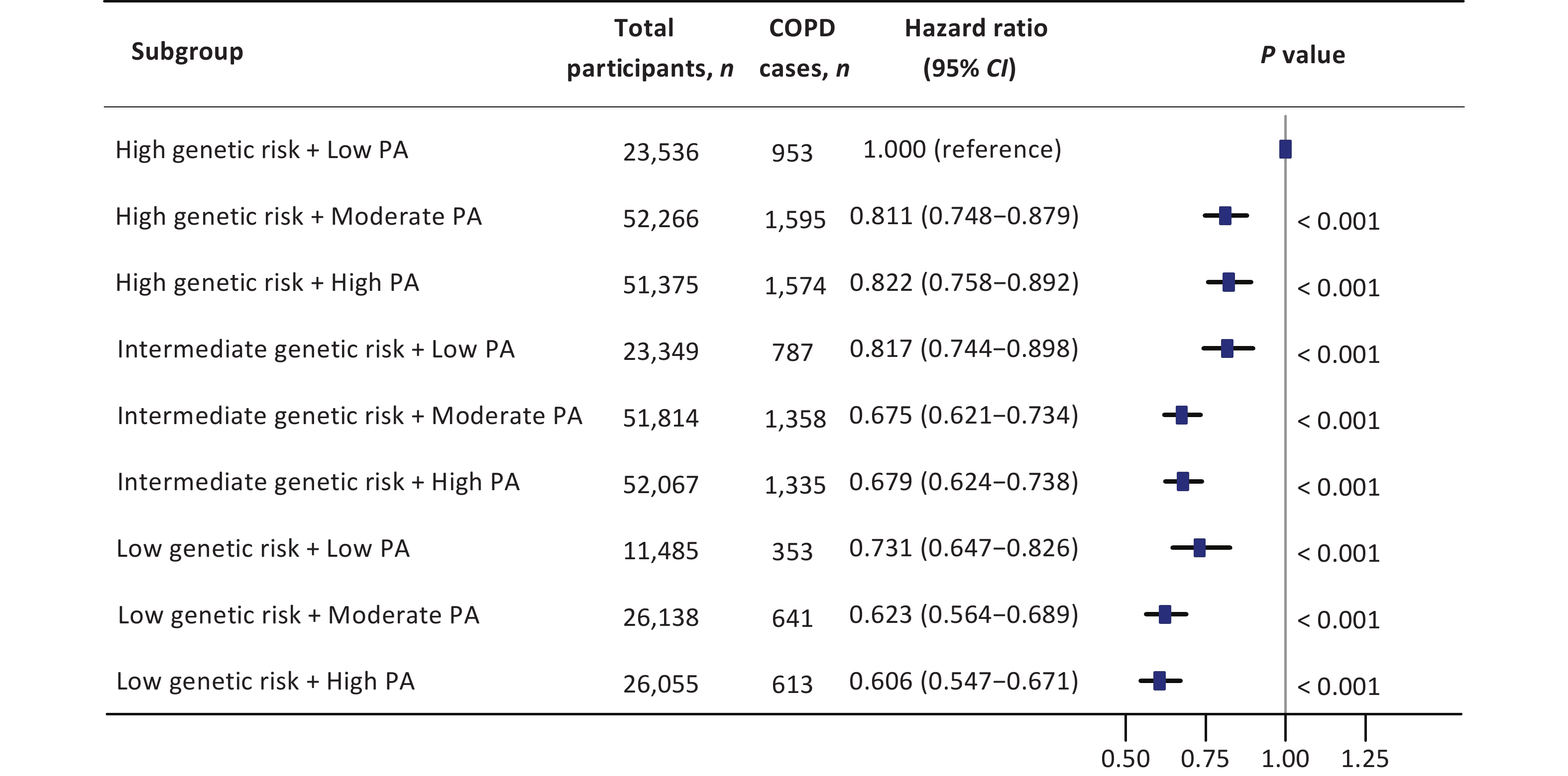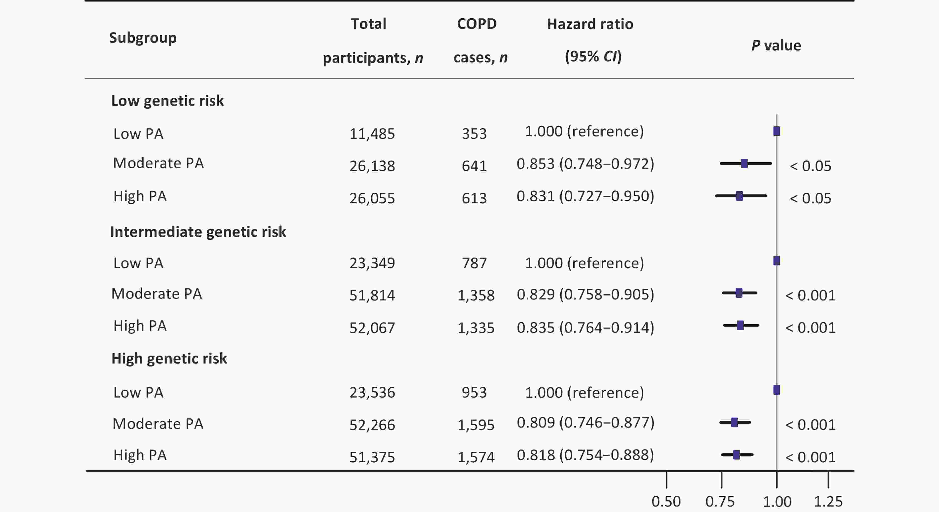 Objective To investigate the relationship between physical activity and genetic risk and their combined effects on the risk of developing chronic obstructive pulmonary disease. Methods This prospective cohort study included 318,085 biobank participants from the UK. Physical activity was assessed using the short form of the International Physical Activity Questionnaire. The participants were stratified into low-, intermediate-, and high-genetic-risk groups based on their polygenic risk scores. Multivariate Cox regression models and multiplicative interaction analyses were used. Results During a median follow-up period of 13 years, 9,209 participants were diagnosed with chronic obstructive pulmonary disease. For low genetic risk, compared to low physical activity, the hazard ratios (HRs) for moderate and high physical activity were 0.853 (95% confidence interval [CI]: 0.748–0.972) and 0.831 (95% CI: 0.727–0.950), respectively. For intermediate genetic risk, the HRs were 0.829 (95% CI: 0.758–0.905) and 0.835 (95% CI: 0.764–0.914), respectively. For participants with high genetic risk, the HRs were 0.809 (95% CI: 0.746–0.877) and 0.818 (95% CI: 0.754–0.888), respectively. A significant interaction was observed between genetic risk and physical activity. Conclusion Moderate or high levels of physical activity were associated with a lower risk of developing chronic obstructive pulmonary disease across all genetic risk groups, highlighting the need to tailor activity interventions for genetically susceptible individuals.