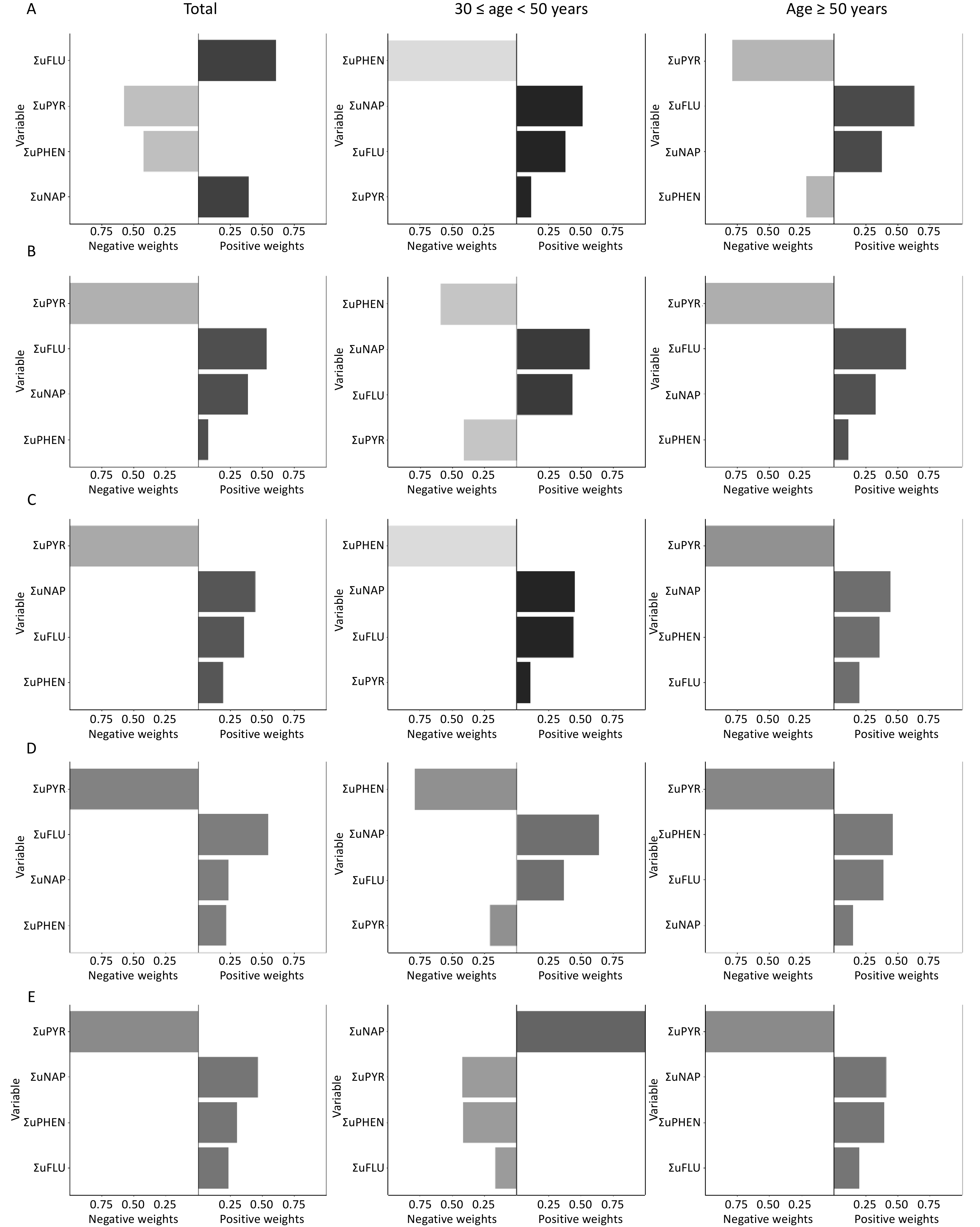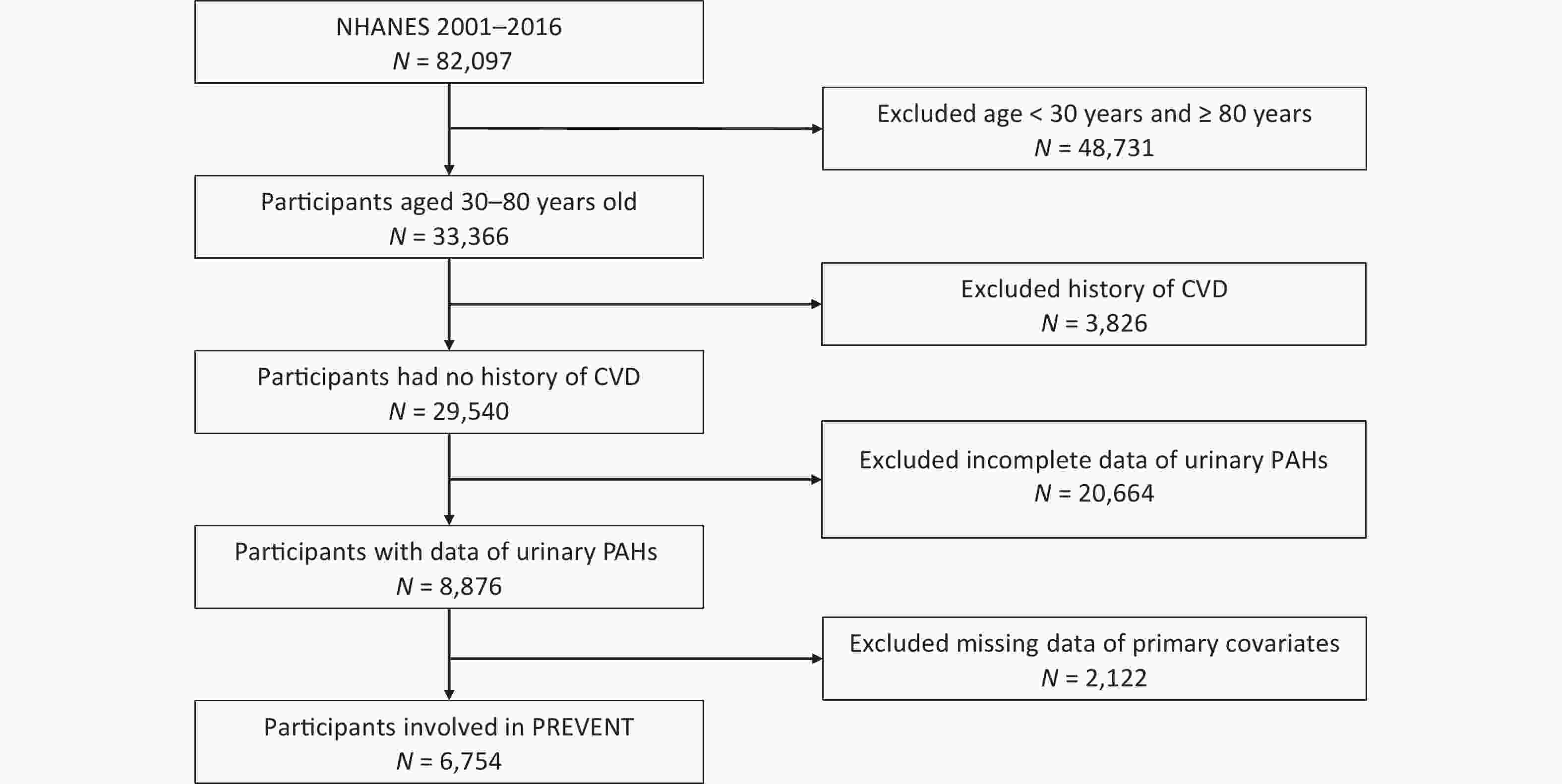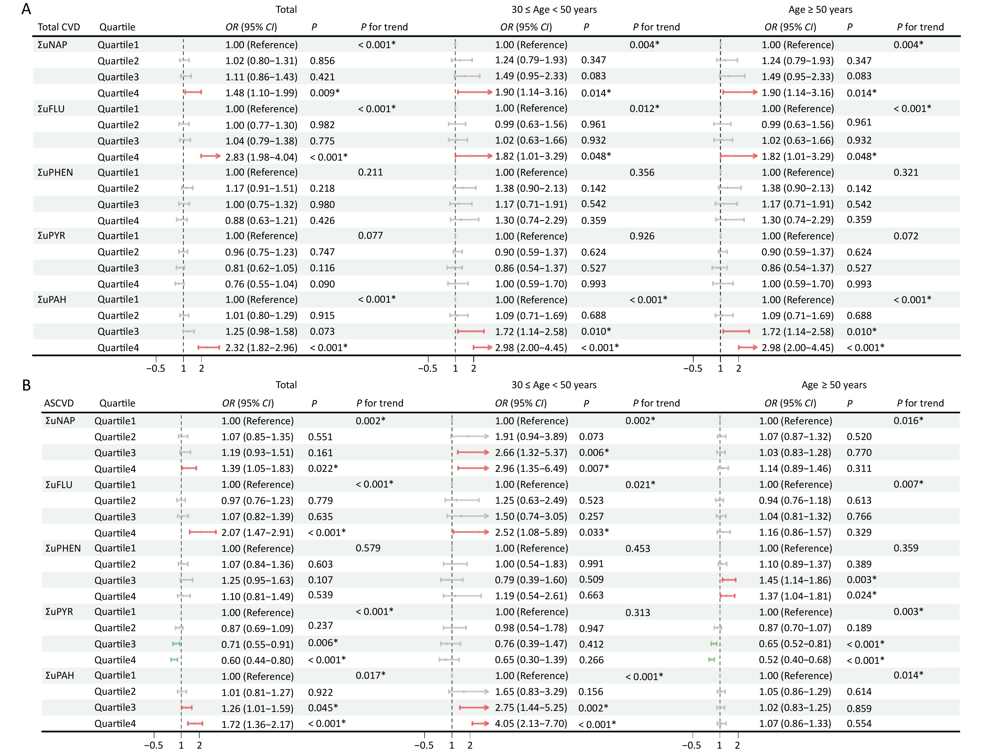 Objective To investigate the association of various polycyclic aromatic hydrocarbon (PAH) metabolites with diverse subtypes of cardiovascular disease (CVD) risk. Methods A novel predicting risk of cardiovascular disease EVENTs PREVENT equation was used to estimate the 10-year diverse subtypes of CVD risk, and their associations with PAH metabolites were analyzed using multiple logistic regression models, the weighted quantile sum (WQS) model, the quantile g-computation (qgcomp) model, and a stratified analysis of subgroups. Results For this study, six thousand seven hundred and forty-five participants were selected, and significant positive associations were observed between PAHs, naphthalene (NAP), and fluorene (FLU), and the risks of total CVD, atherosclerotic cardiovascular disease (ASCVD), and heart failure (HF). NAP and FLU were the primary contributors to the effects of PAH mixtures, and their associations with total CVD, ASCVD, and HF risk were significant in younger participants (30 ≤ age < 50 years); however, the associations of phenanthrene (PHEN) with ASCVD, HF, coronary heart disease (CHD), and stroke were dominant in aging participants (age ≥ 50 years). Notably, pyrene (PYR) was negatively associated with the risk of ASCVD, HF, CHD, and stroke. Similarly, negative associations of PYR with the four CVD subtypes were noticeable in aging participants. Conclusion Different PAHs metabolites had different impacts on each CVD subtype among different age groups. Notably, the protective effects of PYR on ASCVD, HF, CHD, and stroke were noticeable in aging individuals.
