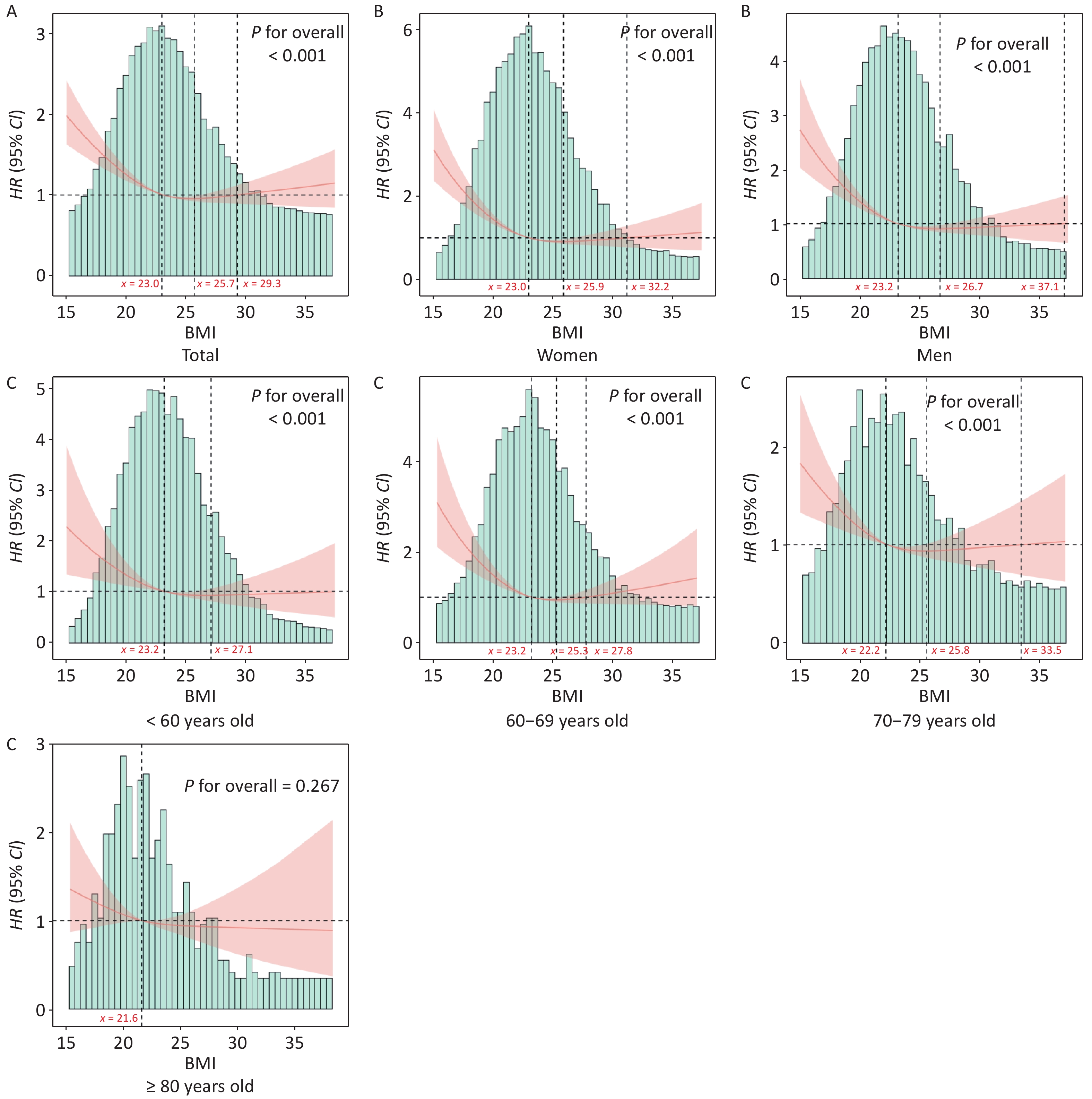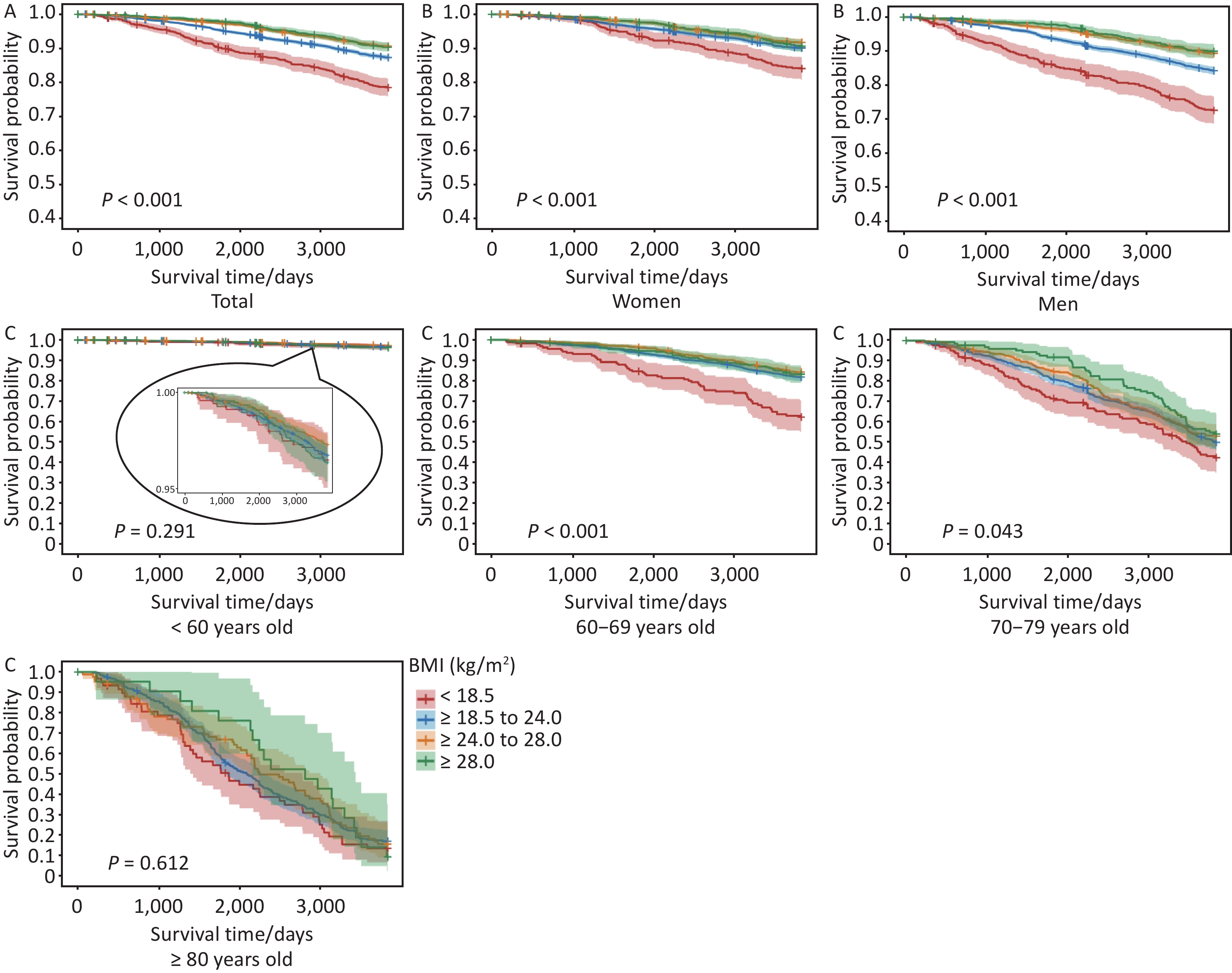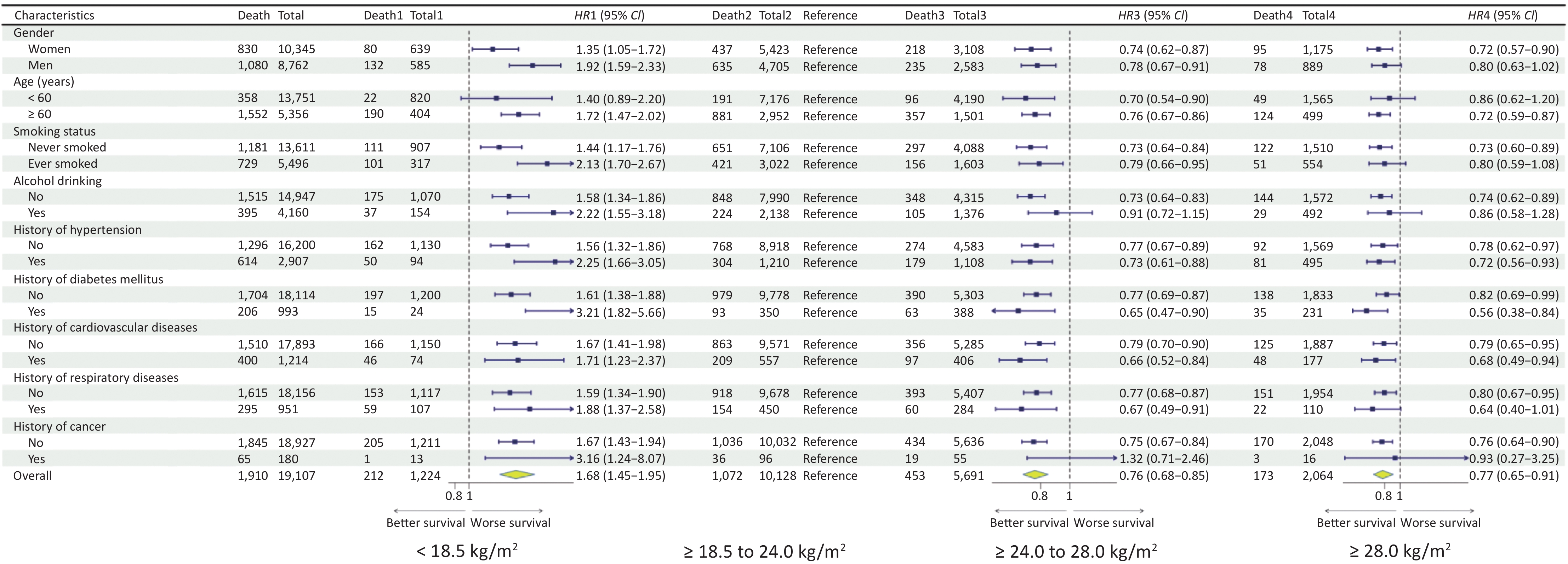 Objective This study aimed to explore the association between body mass index (BMI) and mortality based on the 10-year population-based multicenter prospective study. Methods A general population-based multicenter prospective study was conducted at four sites in rural China between 2013 and 2023. Multivariate Cox proportional hazards models and restricted cubic spline analyses were used to assess the association between BMI and mortality. Stratified analyses were performed based on the individual characteristics of the participants. Results Overall, 19,107 participants with a sum of 163,095 person-years were included and 1,910 participants died. The underweight (< 18.5 kg/m2) presented an increase in all-cause mortality (adjusted hazards ratio [aHR] = 2.00, 95% confidence interval [CI]: 1.66–2.41), while overweight (≥ 24.0 to < 28.0 kg/m2) and obesity (≥ 28.0 kg/m2) presented a decrease with an aHR of 0.61 (95% CI: 0.52–0.73) and 0.51 (95% CI: 0.37–0.70), respectively. Overweight (aHR = 0.76, 95% CI: 0.67–0.86) and mild obesity (aHR = 0.72, 95% CI: 0.59–0.87) had a positive impact on mortality in people older than 60 years. All-cause mortality decreased rapidly until reaching a BMI of 25.7 kg/m2 (aHR = 0.95, 95% CI: 0.92–0.98) and increased slightly above that value, indicating a U-shaped association. The beneficial impact of being overweight on mortality was robust in most subgroups and sensitivity analyses. Conclusion This study provides additional evidence that overweight and mild obesity may be inversely related to the risk of death in individuals older than 60 years. Therefore, it is essential to consider age differences when formulating health and weight management strategies.