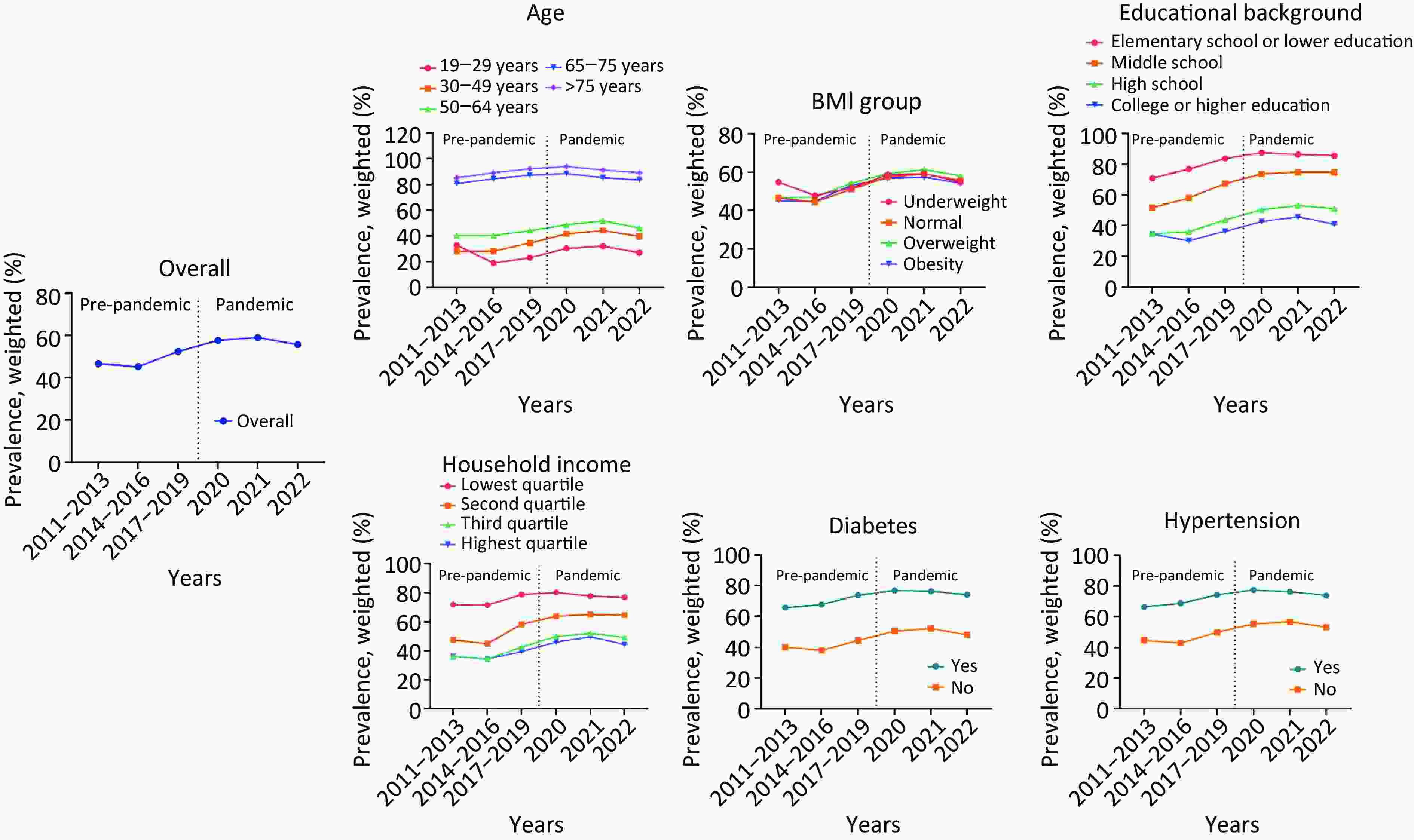 Objective Despite the global decrease in influenza infections during the coronavirus disease 2019 (COVID-19) pandemic, seasonal influenza remains a significant health issue. South Korea, known for its robust pandemic response and high influenza vaccination rates, offers a unique context for examining changes in vaccination trends during the pandemic. Using nationally representative data, we aimed to understand the impact of the pandemic on influenza vaccination behavior over a 12-year period and to identify vulnerable groups. Methods We analyzed influenza vaccination rates in South Korea between 2011–2022, focusing on pandemic-related impacts. The data of 2,426,139 adults (≥ 19 years) from the Korea Community Health Survey were used to assess demographic and sociological factors influencing vaccination behaviors. Results We observed an increase in influenza vaccination rates during the pre-COVID-19 period from 2011–2013 (weighted prevalence: 46.68% [95% confidence interval (CI): 46.55–46.82]) to 2017–2019 (weighted prevalence: 52.50% [95% CI: 52.38–52.63]). However, a significant decline was observed in 2022, the late-COVID-19 pandemic period (weighted prevalence: 55.78% [95% CI: 55.56–56.01]), compared with the mid-pandemic period in 2021 (weighted prevalence: 59.12% [95% CI: 58.91–59.32]), particularly among populations traditionally prioritized for influenza vaccination, including older adults (≥ 65 years) and patients with chronic diseases and low educational and income levels. Conclusion The influenza vaccination rate in South Korea was significantly affected by the COVID-19 pandemic, showing a notable decrease among vulnerable demographic groups. This suggests the need for targeted public health strategies to address vaccine hesitancy and improve vaccination rates, particularly among high-risk populations.