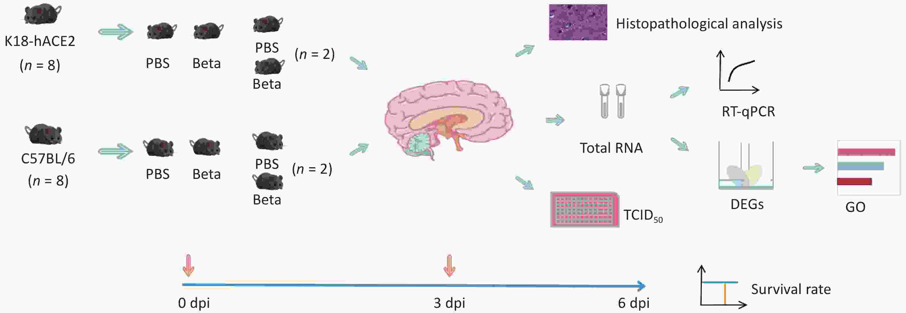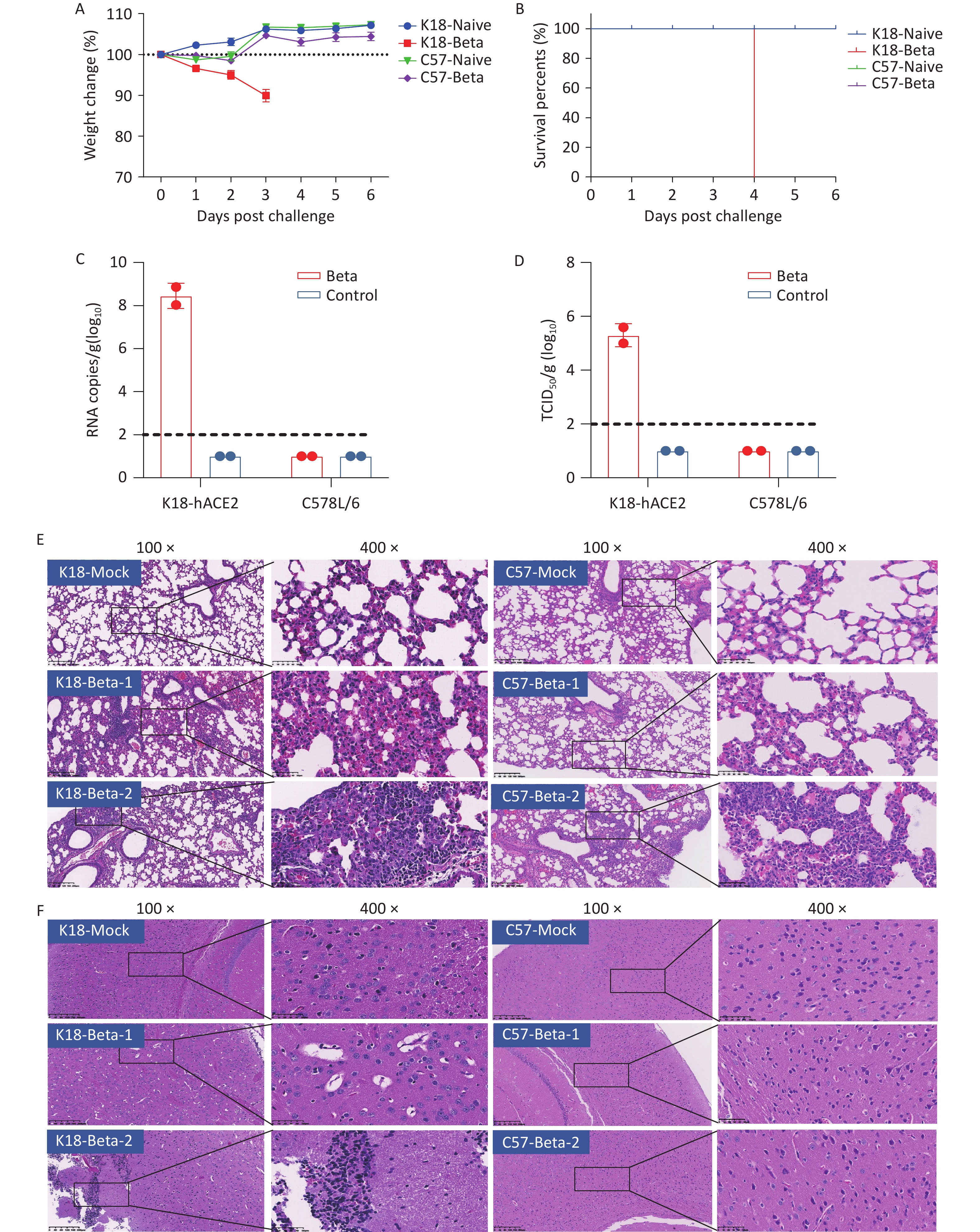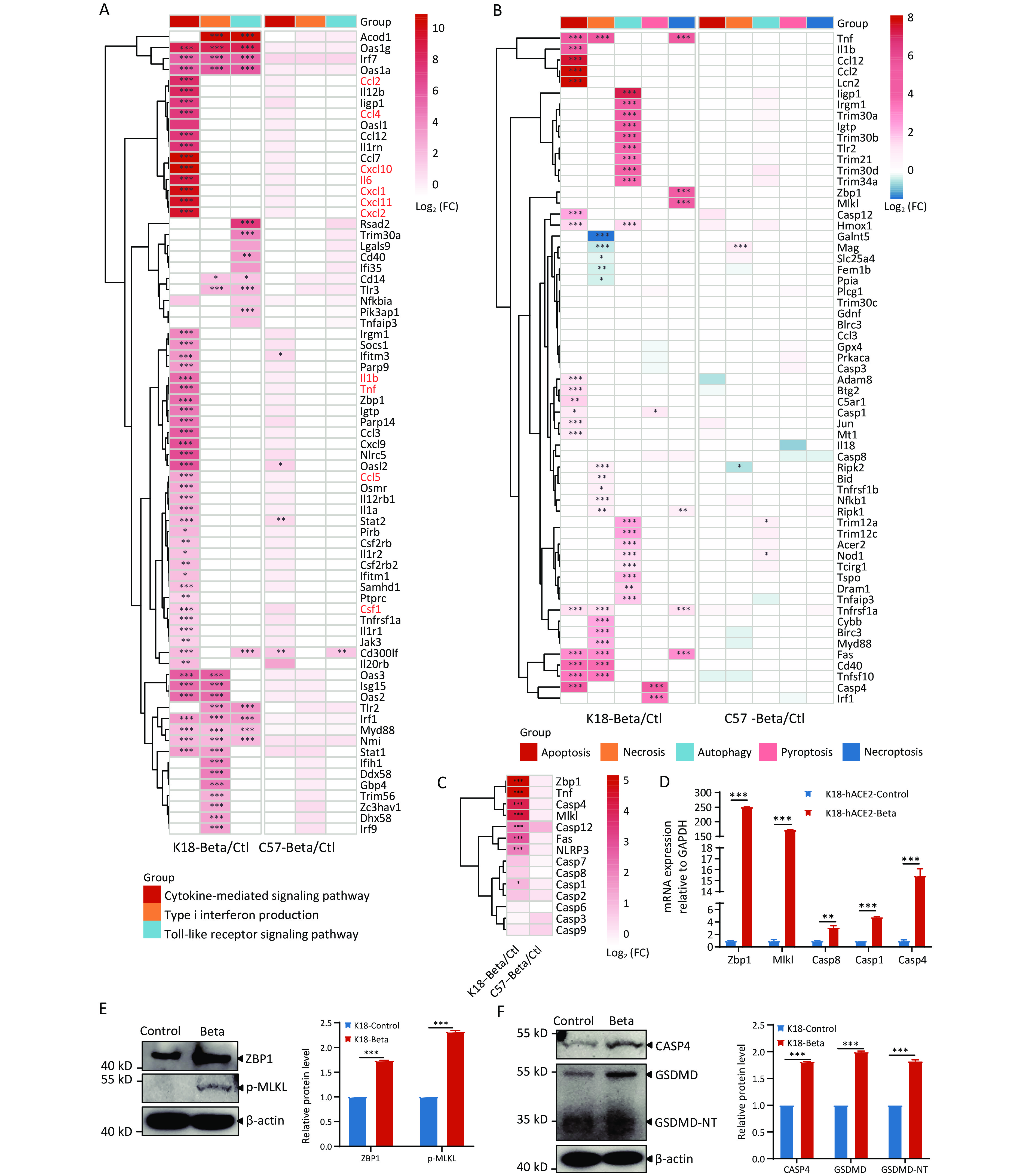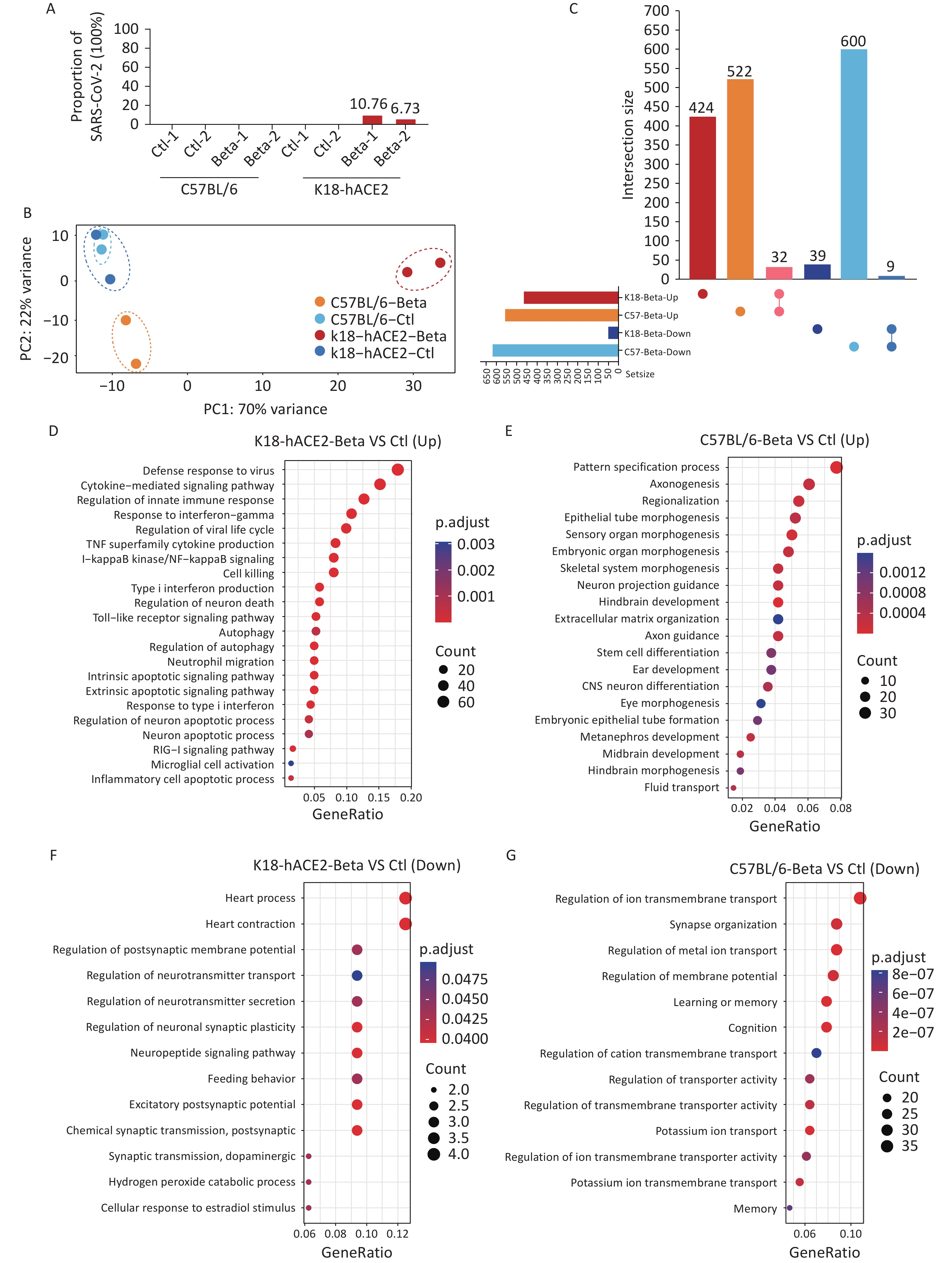 Objective Patients with severe acute respiratory syndrome coronavirus 2 (SARS-CoV-2) infection frequently develop central nervous system damage, yet the mechanisms driving this pathology remain unclear. This study investigated the primary pathways and key factors underlying brain tissue damage induced by the SARS-CoV-2 beta variant (lineage B.1.351). Methods K18-hACE2 and C57BL/6 mice were intranasally infected with the SARS-CoV-2 beta variant. Viral replication, pathological phenotypes, and brain transcriptomes were analyzed. Gene Ontology (GO) analysis was performed to identify altered pathways. Expression changes of host genes were verified using reverse transcription-quantitative polymerase chain reaction and Western blot. Results Pathological alterations were observed in the lungs of both mouse strains. However, only K18-hACE2 mice exhibited elevated viral RNA loads and infectious titers in the brain at 3 days post-infection, accompanied by neuropathological injury and weight loss. GO analysis of infected K18-hACE2 brain tissue revealed significant dysregulation of genes associated with innate immunity and antiviral defense responses, including type I interferons, pro-inflammatory cytokines, Toll-like receptor signaling components, and interferon-stimulated genes. Neuroinflammation was evident, alongside activation of apoptotic and pyroptotic pathways. Furthermore, altered neural cell marker expression suggested viral-induced neuroglial activation, resulting in caspase 4 and lipocalin 2 release and disruption of neuronal molecular networks. Conclusion These findings elucidate mechanisms of neuropathogenicity associated with the SARS-CoV-2 beta variant and highlight therapeutic targets to mitigate COVID-19-related neurological dysfunction.