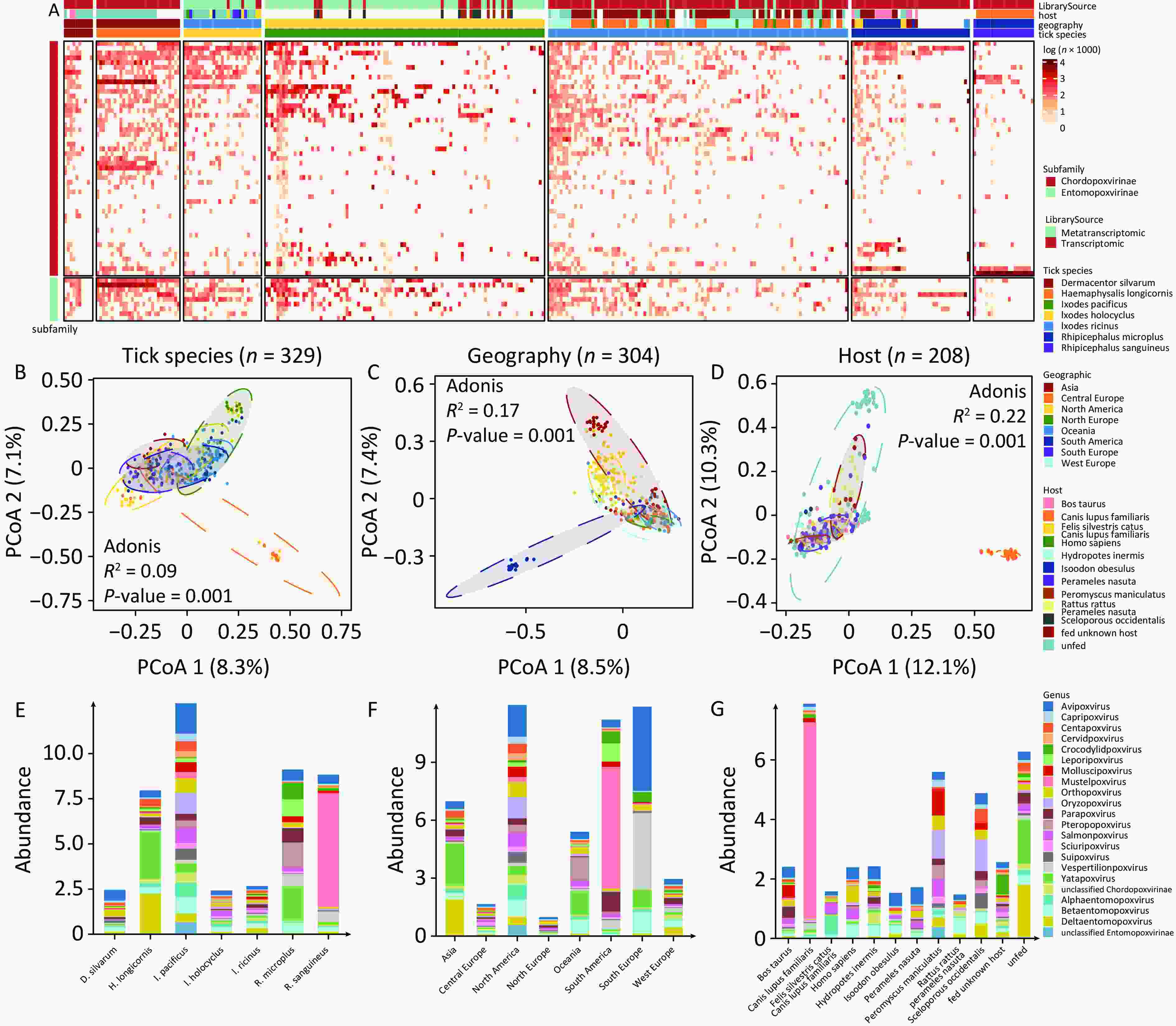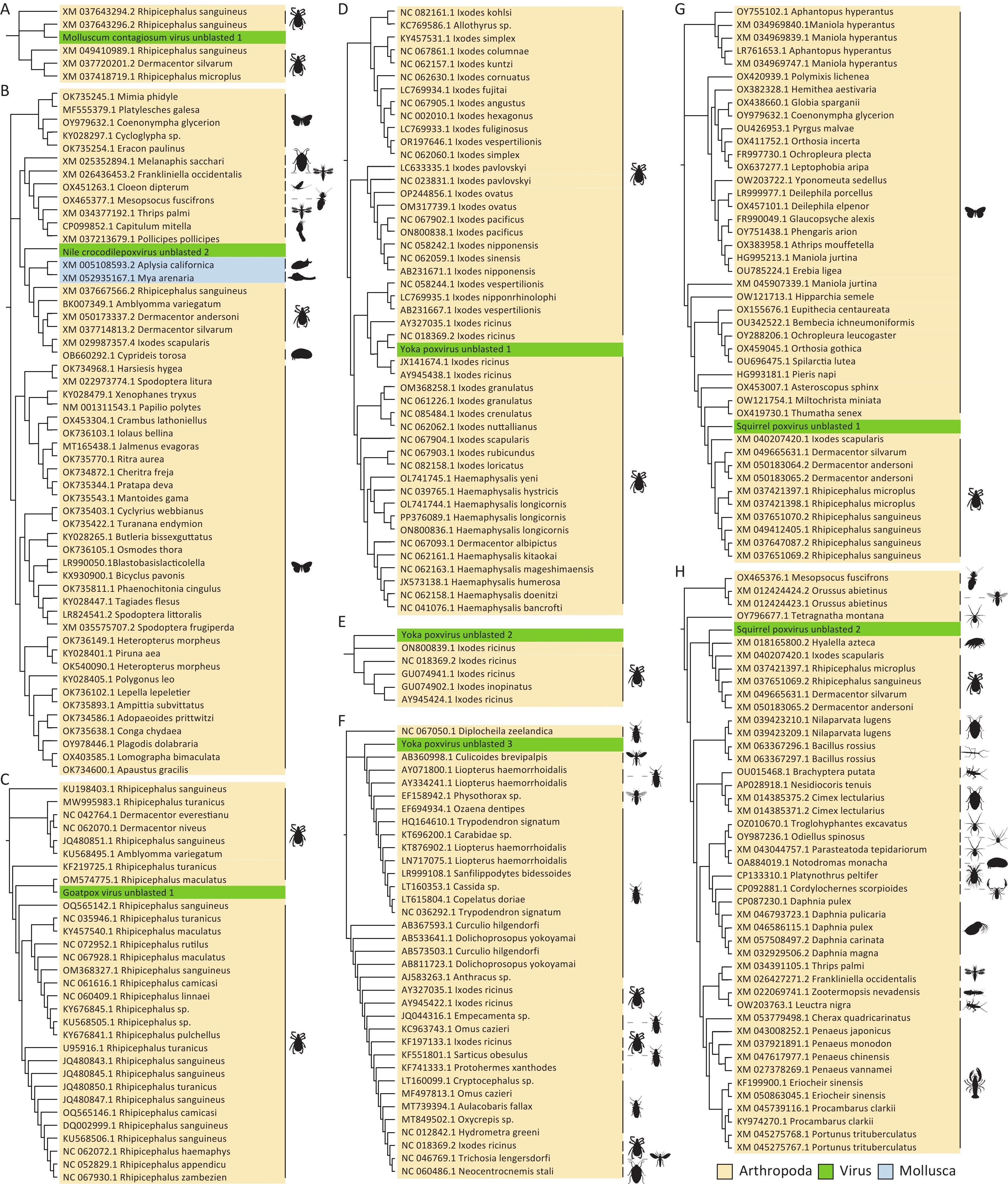 Objective Poxviruses are zoonotic pathogens that infect humans, mammals, vertebrates, and arthropods. However, the specific role of ticks in transmission and evolution of these viruses remains unclear. Methods Transcriptomic and metatranscriptomic raw data from 329 sampling pools of seven tick species across five continents were mined to assess the diversity and abundance of poxviruses. Chordopoxviral sequences were assembled and subjected to phylogenetic analysis to trace the origins of the unblasted fragments within these sequences. Results Fifty-eight poxvirus species, representing two subfamilies and 20 genera, were identified, with 212 poxviral sequences assembled. A substantial proportion of AT-rich fragments were detected in the assembled poxviral genomes. These genomic sequences contained fragments originating from rodents, archaea, and arthropods. Conclusion Our findings indicate that ticks play a significant role in the transmission and evolution of poxviruses. These viruses demonstrate the capacity to modulate virulence and adaptability through horizontal gene transfer, gene recombination, and gene mutations, thereby promoting co-existence and co-evolution with their hosts. This study advances understanding of the ecological dynamics of poxvirus transmission and evolution and highlights the potential role of ticks as vectors and vessels in these processes.