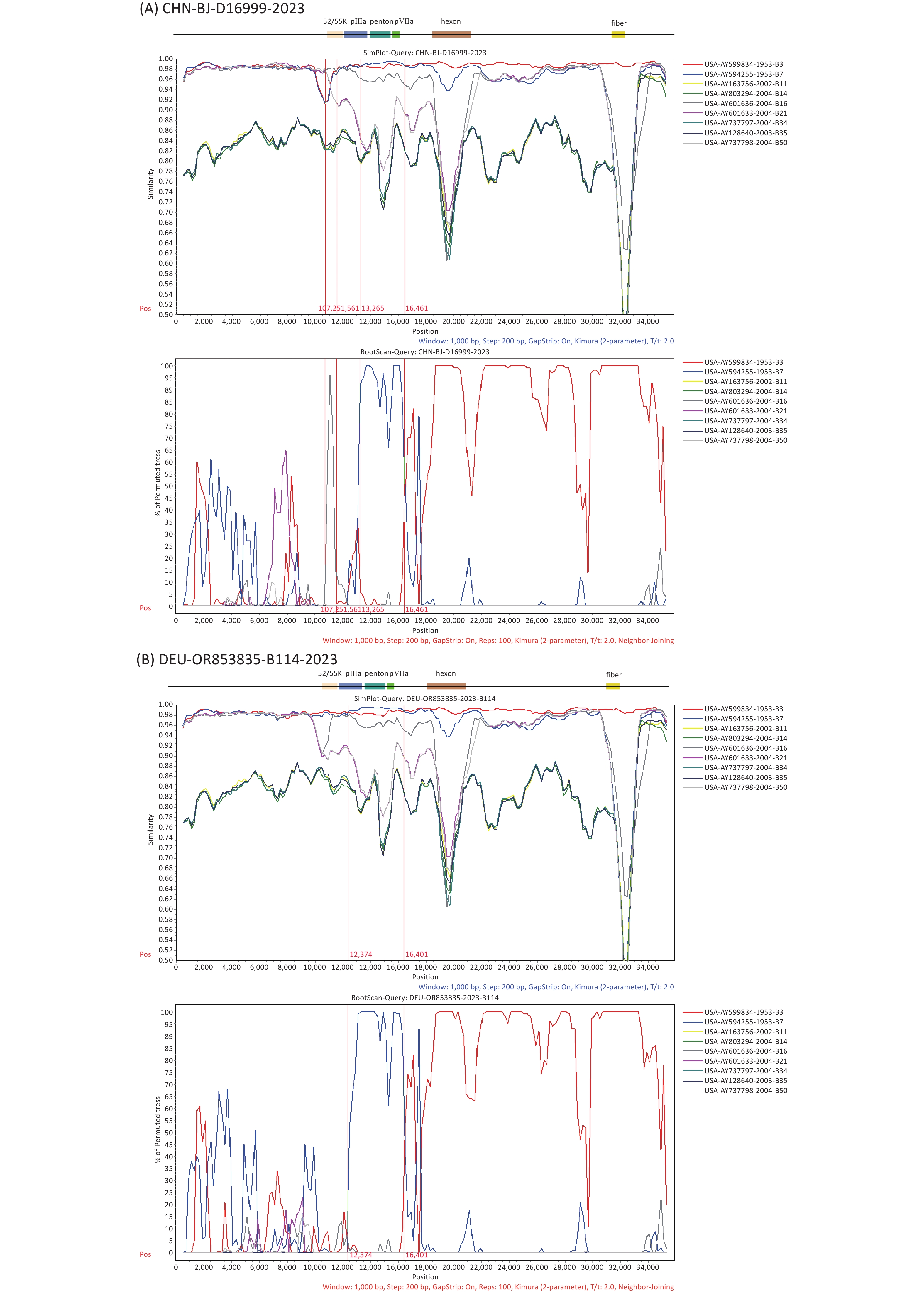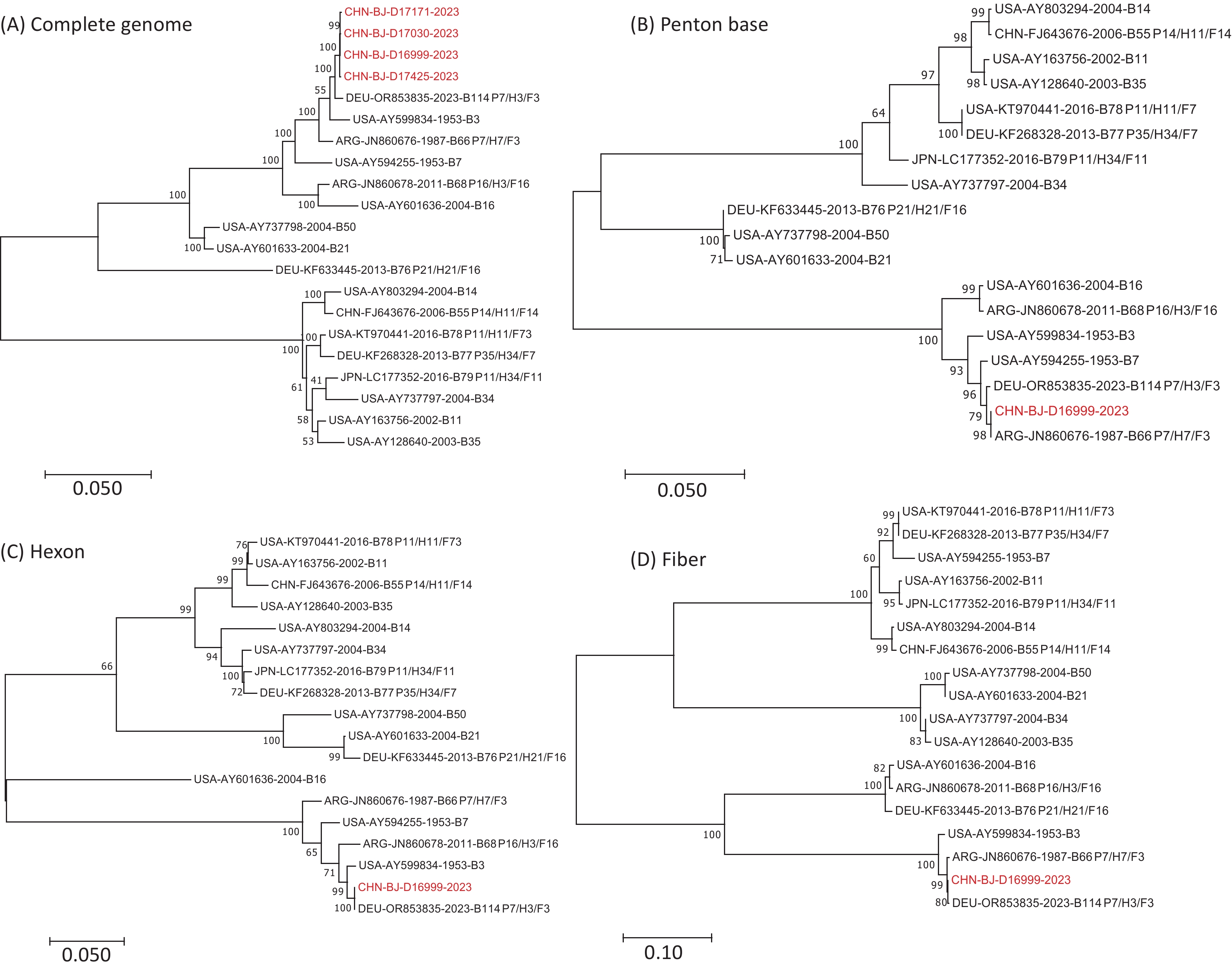 Objective Recombination events are common and serve as the primary driving force of diverse human adenovirus (HAdV), particularly in children with acute respiratory tract infections (ARIs). Therefore, continual monitoring of these events is essential for effective viral surveillance and control. Methods Respiratory specimens were collected from children with ARIs between January 2022 and December 2023. The penton base, hexon, and fiber genes were amplified from HAdV-positive specimens and sequenced to determine the virus type. In cases with inconsistent typing results, genes were cloned into the pGEM-T vector to detect recombination events. Metagenomic next-generation sequencing (mNGS) was performed to characterize the recombinant HAdV genomes. Results Among 6,771 specimens, 277 (4.09%, 277/6,771) were positvie for HAdV, of which 157 (56.68%, 157/277) were successfully typed, with HAdV-B3 being the dominant type (91.08%, 143/157), and 14 (5.05%, 14/277) exhibited inconsistent typing results, six of which belonged to species B. The penton base genes of these six specimens were classified as HAdV-B7, whereas their hexon and fiber genes were classified as HAdV-B3, resulting in a recombinant genotype designated P7H3F3, which closely resembled HAdV-B114. Additionally, a partial gene encoding L1 52/55 kD was identified, which originated from HAdV-B16. Conclusion A novel recombinant, P7H3F3, was identified, containing sequences derived from HAdV-B3 and HAdV-B7, which is similar to HAdV-B114, along with additional sequences from HAdV-B16.