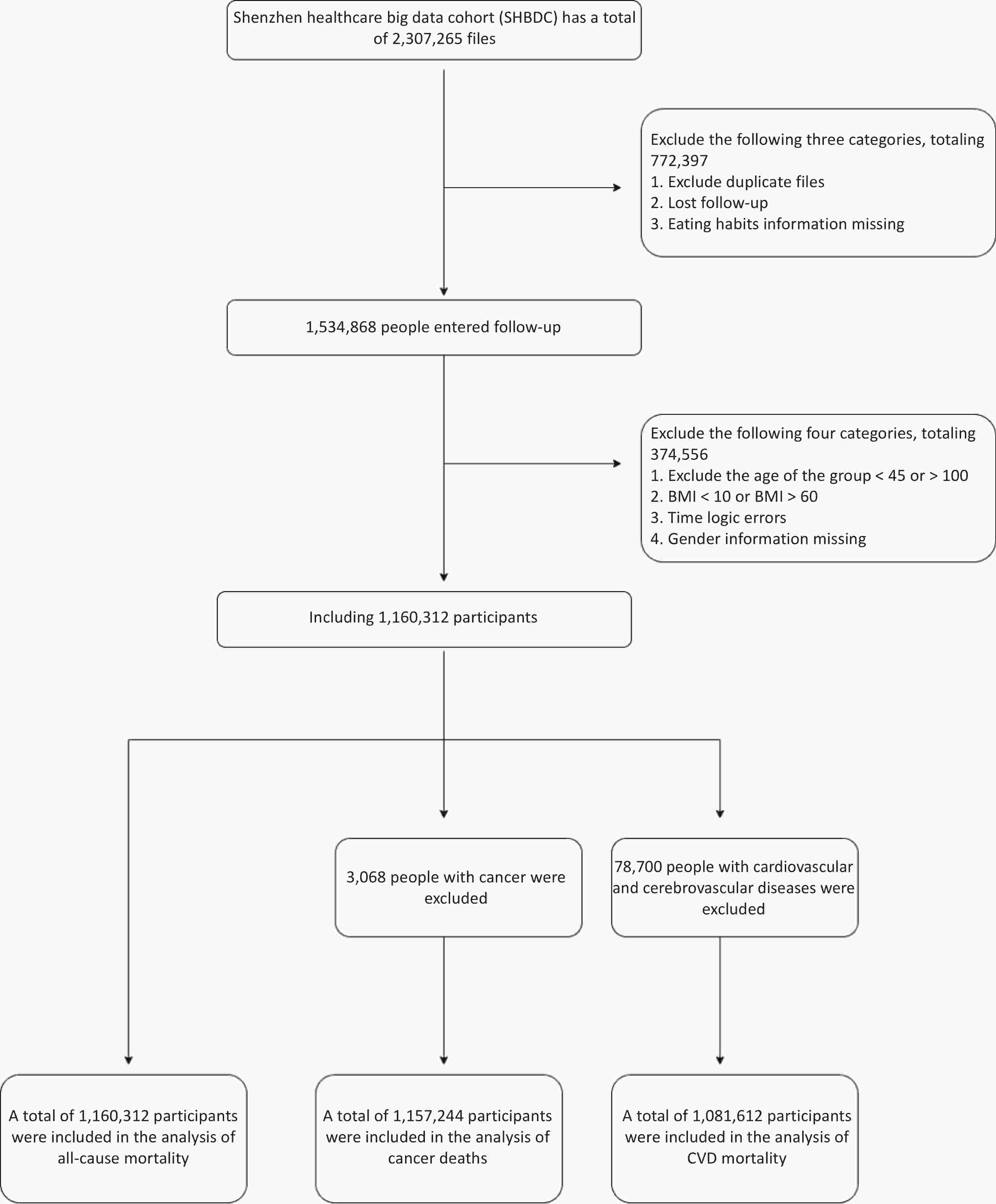 Objective Although dietary preferences influence chronic diseases, few studies have linked dietary preferences to mortality risk, particularly in large cohorts. To investigate the relationship between dietary preferences and mortality risk (all-cause, cancer, and cardiovascular disease [CVD]) in a large adult cohort. Methods A cohort of 1,160,312 adults (mean age 62.48 ± 9.55) from the Shenzhen Healthcare Big Data Cohort (SHBDC) was analyzed. Hazard ratios (HRs) for mortality were estimated using the Cox proportional hazards model. Results The study identified 12,308 all-cause deaths, of which 3,865 (31.4%) were cancer-related and 3,576 (29.1%) were attributed to CVD. Compared with a mixed diet of meat and vegetables, a mainly meat-based diet (hazard ratio [HR] = 1.13; 95% confidence interval [CI]: 1.02, 1.27) associated with a higher risk of all-cause mortality, while mainly vegetarian (HR = 0.87; 95% CI: 0.78, 0.97) was linked to a reduced risk. Furthermore, there was a stronger correlation between mortality risk and dietary preference in the > 65 age range. Conclusion A meat-based diet was associated with an increased risk of all-cause mortality, whereas a mainly vegetarian diet was linked to a reduced risk.