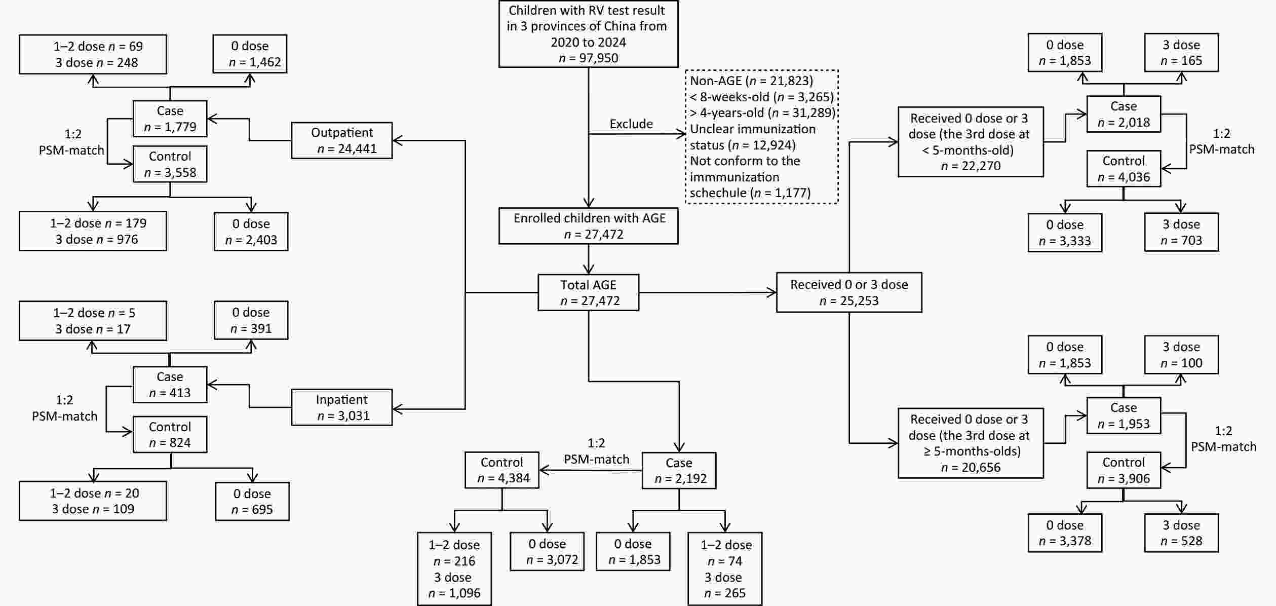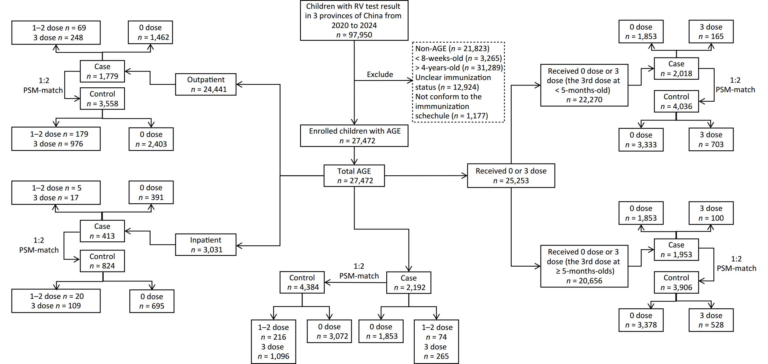 Objective The objective of our study was to evaluate the vaccine effectiveness (VE) of the pentavalent rotavirus vaccine (RV5) among < 5-year-old children in three provinces of China during 2020–2024 via a propensity score-matched test-negative case-control study. Methods Electronic health records and immunization information systems were used to obtain data on acute gastroenteritis (AGE) cases tested for rotavirus (RV) infection. RV-positive cases were propensity score matched with RV-negative controls for age, visit month, and province. Results The study included 27,472 children with AGE aged 8 weeks to 4 years at the time of AGE diagnosis; 7.98% (2,192) were RV-positive. The VE (95% confidence interval, CI) of 1–2 and 3 doses of RV5 against any medically attended RV infection (inpatient or outpatient) was 57.6% (39.8%, 70.2%) and 67.2% (60.3%, 72.9%), respectively. Among children who received the 3rd dose before turning 5 months of age, 3-dose VE decreased from 70.4% (53.9%, 81.1%) (< 5 months since the 3rd dose) to 63.0% (49.1%, 73.0%) (≥ 1 year since the 3rd dose). The three-dose VE rate was 69.4% (41.3%, 84.0%) for RVGE hospitalization and 57.5% (38.9%, 70.5%) for outpatient-only medically attended RVGE. Conclusion Three-dose RV5 VE against rotavirus gastroenteritis (RVGE) in children aged < 5 years was higher than 1-2-dose VE. Three-dose VE decreased with time since the 3rd dose in children who received the 3rd dose before turning five months of age, but remained above 60% for at least one year. VE was higher for RVGE hospitalizations than for medically attended outpatient visits.