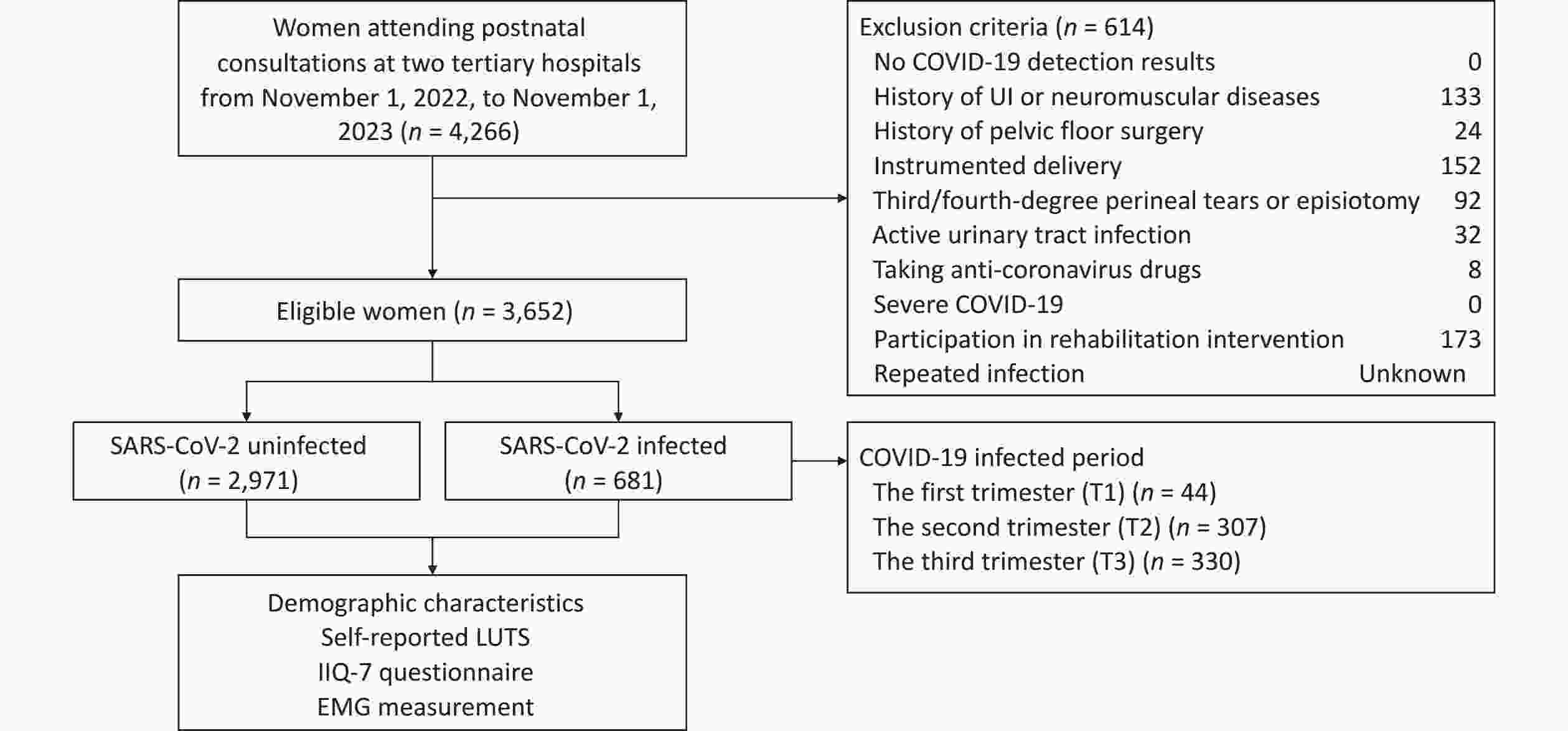 Objective Coronavirus disease 2019 (COVID-19) can result in fatigue and post-exertional malaise; however, whether severe acute respiratory syndrome coronavirus 2 (SARS-CoV-2) infection exacerbates lower urinary tract symptoms (LUTS) is unclear. This study investigated the association between prenatal SARS-CoV-2 infection and postpartum LUTS. Methods A multicenter, retrospective cohort study was conducted at two tertiary hospitals in China from November 1, 2022, to November 1, 2023. Participants were classified into infected and uninfected groups based on SARS-CoV-2 antigen results. LUTS prevalence and severity were assessed using self-reported symptoms and the Incontinence Impact Questionnaire-Short Form (IIQ-7). Pelvic floor muscle activity was measured using electromyography following the Glazer protocol. Group comparisons were performed to evaluate the association of SARS-CoV-2 infection with LUTS and electromyography parameters, with stratified analyses conducted using SPSS version 26.0. Results Among 3,652 participants (681 infected, 2,971 uninfected), no significant differences in LUTS prevalence or IIQ-7 scores were observed. However, SARS-CoV-2 infection was an independent factor influencing the electromyographic activity of the pelvic floor muscles (mean tonic contraction amplitudes), regardless of delivery mode (P = 0.001). Conclusion Prenatal SARS-CoV-2 infection was not significantly associated with an increased risk of postpartum LUTS but independently altered pelvic floor muscle electromyographic activity, suggesting potential neuromuscular effects.