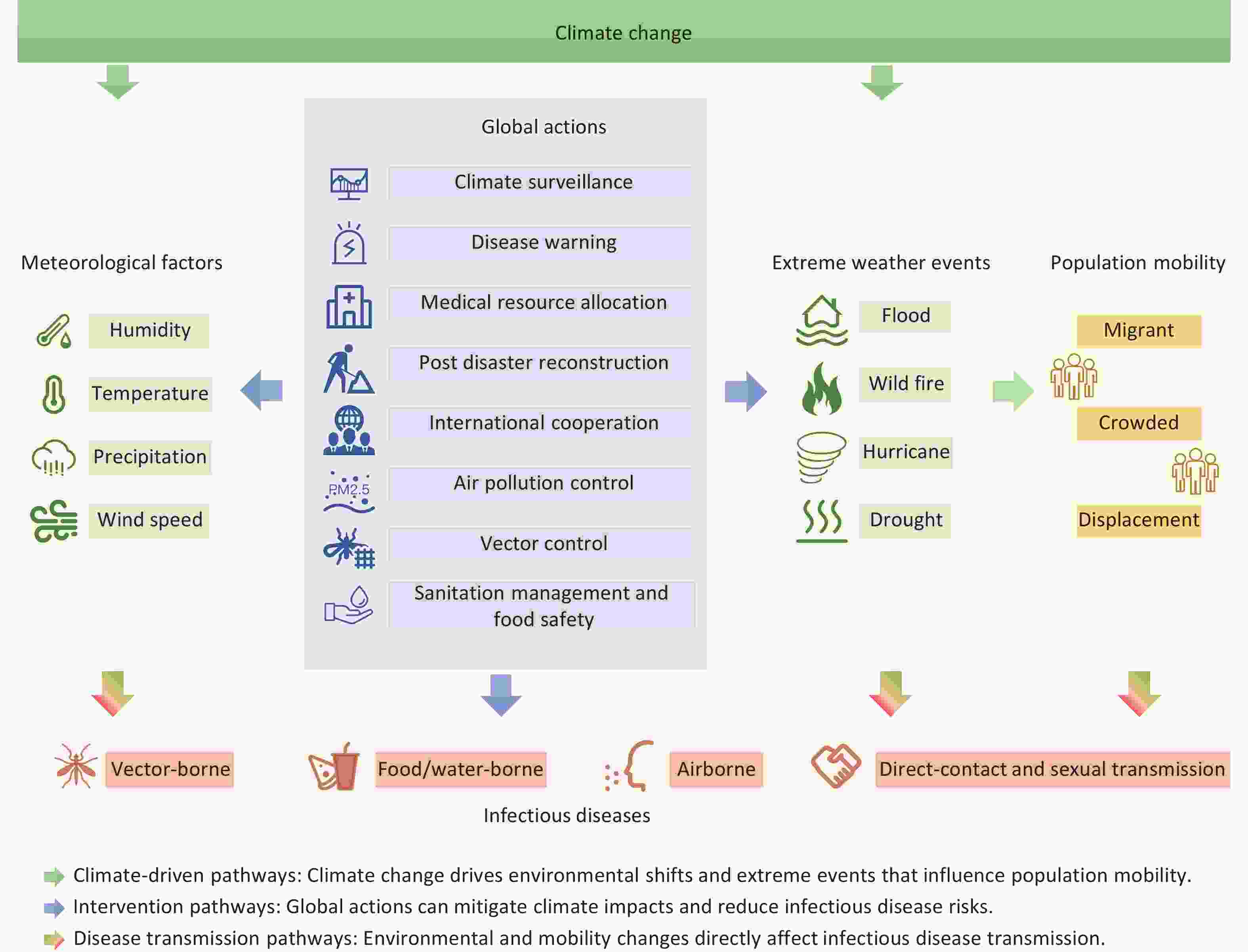 Climate and weather significantly influence the duration, timing, and intensity of disease outbreaks, reshaping the global landscape of infectious diseases. Rising temperatures and shifts in precipitation patterns driven by climate change can directly impact the survival and reproduction of pathogens and vector organisms. Moreover, climate change is expected to exacerbate extreme weather events, including floods and droughts, which can disrupt infrastructure and increase the risk of water- and foodborne diseases. There are potential shifts in the temporal and spatial patterns of infectious disease transmission owing to climate change. Furthermore, climate change may alter the epidemiology of vaccine-preventable diseases. These climatic variations not only affect the ecological characteristics of pathogens and vectors but also indirectly influence human behaviors and socioeconomic conditions, further amplifying disease transmission risks. Addressing this challenge requires an interdisciplinary collaboration and comprehensive public health strategies. This review aims to synthesize the current evidence on the impact of climate change on climate-sensitive infectious diseases and elucidate the underlying mechanisms and transmission pathways. Additionally, we explored adaptive policy strategies to mitigate the public health burden of infectious diseases in the context of climate change, offering insights for global health governance and disease control efforts.